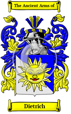 | Dietrich History, Family Crest & Coats of Arms Etymology of DietrichWhat does the name Dietrich mean? The Dietrich surname derives from the Germanic personal name Tederich (Theudoricus), which was composed of the elements "theud," meaning "people," or "race," and "ric," meaning "powerful." Early Origins of the Dietrich familyThe surname Dietrich was first found in Switzerland, where the name Dietrich emerged in mediaeval times as one of the notable families of the region. The popularity of the name can be traced back to the major figure of Theodrich the Great, King of the Goths in the 5th century. From the 13th century the surname was identified with the great social and economic evolution which made this territory a landmark contributor to the development of the nation. Early History of the Dietrich familyThis web page shows only a small excerpt of our Dietrich research. Another 117 words (8 lines of text) covering the years 1825 and 1855 are included under the topic Early Dietrich History in all our PDF Extended History products and printed products wherever possible. Dietrich Spelling VariationsSpelling variations of this family name include: Dieterich, Dietrich, Dittrich, Diterich, Deeterich, Dieterick, Diterichs, Diterig and many more. Early Notables of the Dietrich family- Joseph von Dietrich (d. 1855), who made his fortune supplying the armies during the French campaigns, and received a Hungarian baronetcy in 1825