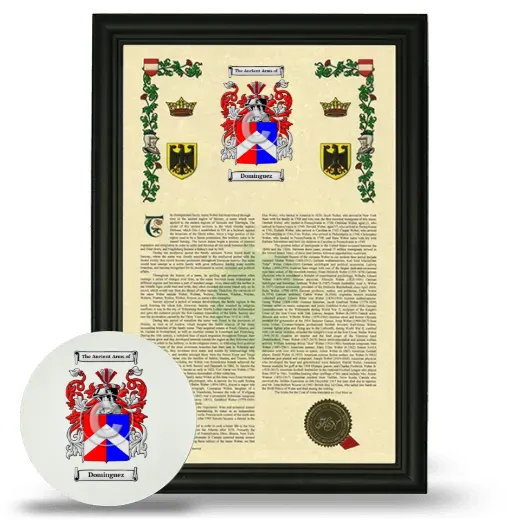 The Armorial will be framed with our custom solid 1" wood frame which beautifully compliments the earliest rendition of your Coat of Arms, Family Crest, and Surname History.