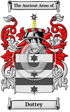 England Etymology of DotteyWhat does the name Dottey mean? The origins of the Dottey surname date from the ancient Anglo-Saxon culture of Britain. Their name originated with an early member who was a person who was considered brave and strong. The surname Dottey originally derived from the Old English word doughty or dohti which meant valiant, hardy, manly. 1 Most sources agree that this is the generally accepted origin of the name. However, one source claims the name to be Norman in origin as the Magni Rotuli Scaccarii Normanniae notes William de Oughtia, Normandy 1180, 1198. 2 Early Origins of the Dottey familyThe surname Dottey was first found in Yorkshire where early spellings of the name varied greatly. By example, the Yorkshire Poll Tax Rolls of 1379 included: Johanna Doughti; Johannes Doughty, taylour; and Adam Doughty. In the East Riding of Yorkshire, the Poll Tax Rolls for Howdenshire included Robertus Dughty and Johannes Dughti. 3 While most of the records of the name come from Yorkshire, we must look to Bedfordshire for the first record. For it is here that William Douti held lands as listed in the Assize Rolls in 1247. Later, William Doughty was listed in Leicestershire in 1300 and John Dughti was listed as a Freeman of York in 1314. 4 Early History of the Dottey familyThis web page shows only a small excerpt of our Dottey research. Another 116 words (8 lines of text) covering the years 1365, 1533, 1545, 1577, 1578, 1598, 1599, 1613, 1620, 1655, 1672 and 1792 are included under the topic Early Dottey History in all our PDF Extended History products and printed products wherever possible. Dottey Spelling VariationsThe English language only became standardized in the last few centuries; therefore, spelling variations are common among early Anglo-Saxon names. As the form of the English language changed, even the spelling of literate people's names evolved. Dottey has been recorded under many different variations, including Doughty, Doughtie, Dowtie, Dowty and others. Early Notables of the Dottey familyThomas Doughty (1545-1578), an English nobleman, soldier, scholar and personal secretary of Christopher Hatton. His association with Francis Drake, on a 1577 voyage to interfere with Spanish treasure fleets, ended in a shipboard trial for treason and witchcraft and Doughty's execution.