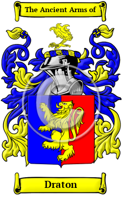 England Etymology of DratonWhat does the name Draton mean? Draton is a name of ancient Anglo-Saxon origin and comes from the family once having lived in one of the many places called Drayton, or in the settlement of Dreyton in Devon. The reason for the multitude of place names is because the place name literally means "farmstead at or near a portage or slope used for dragging down loads," from the Old English words "draeg" + "tun." 1 Exploring Drayton-in-Hales, or Market-Drayton in Shropshire for a moment, we found "Nennius endeavours to identify this place with the Caer Draithon of the Britons, enumerating it as one of the principal cities belonging to that people; and the correctness of his opinion has not been arraigned by any succeeding writer. It is evident from the discovery of the foundations of several houses in the adjoining fields, that the town anciently occupied a more extended site than it does at present. In the record of Domesday it is mentioned by the name Draitune. The manor was successively in the possession of the abbot of St. Ebrulph, in Normandy, and the abbot of Combermere, in Cheshire." 2 Early Origins of the Draton familyThe surname Draton was first found in the Hundredorum Rolls of 1273 where Matilda de Drayton, Cambridgeshire; and Beatrix He Draytone, Huntingdonshire, were both listed as holding lands that time. A few years later, Richard de Drayton, was listed as bailiff of Yarmouth, Norfolk in 1284. 3 Later in Yorkshire, the Yorkshire Poll Tax Rolls of 1379 listed Johannes de Drayton; Willelmus de Draghton; and Robertas de Draghton. 4 Early History of the Draton familyThis web page shows only a small excerpt of our Draton research. Another 89 words (6 lines of text) covering the years 1363, 1369, 1376, 1563, 1604 and 1631 are included under the topic Early Draton History in all our PDF Extended History products and printed products wherever possible. Draton Spelling VariationsSound was what guided spelling in the essentially pre-literate Middle Ages, so one person's name was often recorded under several variations during a single lifetime. Also, before the advent of the printing press and the first dictionaries, the English language was not standardized. Therefore, spelling variations were common, even among the names of the most literate people. Known variations of the Draton family name include Drayton, Draydon, Draton, Dradon and others. Early Notables of the Draton familyNicholas de Drayton (fl. 1376), English ecclesiastic and judge, appointed warden of King's College, Cambridge, on 1 Dec. 1363, with a salary of fourpence a day, and an allowance of eight marcs per annum for robes. In 1369 he was suspected of heresy, and the Bishop of London was authorised to commit him to prison (20 March). In 1376 he was appointed a Baron of the Exchequer. The date of his death is uncertain. He is commonly described as 'magister.' 5