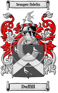 | Duffill History, Family Crest & Coats of Arms Etymology of DuffillWhat does the name Duffill mean? The name Duffill is part of the ancient legacy of the Anglo-Saxon tribes of Britain. It is a product of when the family lived in either of the towns named Duffield in Derbyshire and in North Yorkshire. The surname Duffill belongs to the large category of Anglo-Saxon habitation names, derived from pre-existing names for towns, villages, parishes, or farmsteads. Early Origins of the Duffill familyThe surname Duffill was first found in North Yorkshire at either North or South Duffield, villages and civil parishes in the Selby District. The place name dates back to the Domesday Book where it was listed as Dufeld. Alternatively, the name could have originated from Duffield, a village, beside the River Derwent, at its junction with the River Ecclesbourne in Derbyshire. This locale also dates back to the Domesday Book where it was listed as Duvelle, but by the 12th century, the locale was known as Duffeld. The place name literally means "open land frequented by doves." 1 "In Domesday Book it is called Dunelle, and is described as having 'a church, a priest, and two mills;' it afterwards formed part of the demesne of Henry de Ferrers, who, in 1096, possessed a castle on an eminence north-west of the village, the site of which is now named Castle-Orchard." 2 Early History of the Duffill familyThis web page shows only a small excerpt of our Duffill research. Another 200 words (14 lines of text) covering the years 1190, 1273, 1379, 1383 and 1678 are included under the topic Early Duffill History in all our PDF Extended History products and printed products wherever possible. Duffill Spelling VariationsThe first dictionaries that appeared in the last few hundred years did much to standardize the English language. Before that time, spelling variations in names were a common occurrence. The language was changing, incorporating pieces of other languages, and the spelling of names changed with it. Duffill has been spelled many different ways, including Duffield, Duffeld, Duffell, Duffill, Duffitt and others. Early Notables of the Duffill familyAnother 47 words (3 lines of text) are included under the topic Early Duffill Notables in all our PDF Extended History products and printed products wherever possible. Migration of the Duffill family to IrelandSome of the Duffill family moved to Ireland, but this topic is not covered in this excerpt. Another 35 words (2 lines of text) about their life in Ireland is included in all our PDF Extended History products and printed products wherever possible.