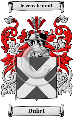 | Duket History, Family Crest & Coats of Arms Early Origins of the Duket familyThe surname Duket was first found in Lincolnshire where Richard Duket was listed Henry III-Edward I in the Testa de Nevill, sive Liber Feodorum, temp. Henry III-Edward I. 1 The Hundredorum Rolls of 1273 listed Dulcia Duket with no county. Later the Yorkshire Poll Tax Rolls of 1379 listed Adam Doket; Johannes Doket; and Willelmus Dokettii. 2 Sir Richard Duket (died 1245) was an English Crown official in England and Ireland. He was a judge, diplomat, King's Messenger, Sheriff and Royal Secretary. "The Somersetshire Ducketts have their home in Weston-super- Mare. William Duckett, Esq., lived at Hartham, Wilts, in the reign of Charles II. The name of Duket occurred in Oxfordshire and in London in the 13th century. The name of Duckett or Duckitt is also established around Doncaster, in the West Riding [of Yorkshire]. The Ducketts or Duckitts are now principally represented near the Lincolnshire border in the Doncaster district. The Ducketts of Fillingham, Lincolnshire, were resident there in the 13th century. " 3 Another noted author has other records that are of interest. Rannulf Duchet was listed in the Pipe Rolls for Hampshire in 1130 and Herbert Duket was listed in the Pipe Rolls of Hertfordshire in 1176. "The surname is common, usually as Duket, and the persistent -et dissociates it from DUCAT. Duchet 1148 Winton is probably identical with Ralph Duchet but we seem to have a clear example of a personal name in Duchet 1185 Templars [Kent and ], Duket [in the Pipe Rolls for Kent in ] 1198. Willelmus filius Duket (1301 Subsidy Rolls for Yorkshire) and Doket Flasby (1379 Yorkshire Poll Tax Rolls) are probably diminutives of Marmaduke, a purely northern name." 4 Early History of the Duket familyThis web page shows only a small excerpt of our Duket research. Another 54 words (4 lines of text) covering the years 1484, 1572, 1580, 1601, 1613, 1621, 1624, 1644, 1648, 1651, 1659, 1679, 1682, 1686, 1693, 1705, 1708, 1722 and 1732 are included under the topic Early Duket History in all our PDF Extended History products and printed products wherever possible. Duket Spelling VariationsSpelling variations of this family name include: Ducket, Duchett, Duchette, Duckett, Duckette and others. Early Notables of the Duket familyAndrew Doket or Ducket (d. 1484), first president of Queens' College, Cambridge, generally thought to have been principal of St. Bernard's Hostel, of which he may probably have been the founder, and certainly was the owner. 5