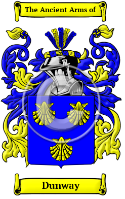 The surname Dunway was first found in Suffolk where they held a family seat as Lords of the Manor. After the Battle of Hastings in 1066, William, Duke of Normandy, having prevailed over King Harold, granted most of Britain to his many victorious Barons. It was not uncommon to find a Baron, or a Bishop, with 60 or more Lordships scattered throughout the country. These he gave to his sons, nephews and other junior lines of his family and they became known as under-tenants. They adopted the Norman system of surnames which identified the under-tenant with his holdings so as to distinguish him from the senior stem of the family. After many rebellious wars between his Barons, Duke William, commissioned a census of all England to determine in 1086, settling once and for all, who held which land. He called the census the Domesday Book, 1 indicating that those holders registered would hold the land until the end of time. Hence, conjecturally, the surname is descended from the tenant of the lands of Dunwich, now submerged by the sea, held by Robert Malet, a Norman Baron, who was recorded in the Domesday Book census of 1086.