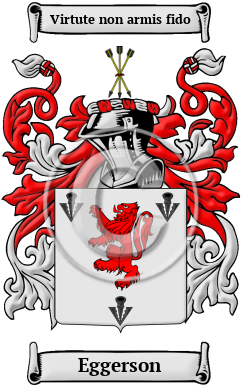 England Etymology of EggersonWhat does the name Eggerson mean? The ancestors of the bearers of the Eggerson family name are thought have lived in ancient Anglo-Saxon England. They were first found in Egerton, in the county of Cheshire. It is now called Egerton Green. The place-name is derived from the Old English personal name Ecghere and tun, a word which meant enclosure, farm, or settlement, and later came to mean fort, and then town. The name would translate as farm belonging to Ecghere. Early Origins of the Eggerson familyThe surname Eggerson was first found in Cheshire at Egerton Green which dates back to 1259 when it was listed as Eggerton. The place name literally meant "farmstead of a man called Ecghere," from the Old English personal name + "tun." 1 The suffix "green" was added in the 18th century. There is another local named Egerton or Egerton (St James) in Kent, a parish, in the union of West Ashford, hundred of Calehill. In this latter case, this place dates back to c.1100 when it was listed as Eardingtun and later as Egarditon in 1203. 1 Some of the family were found in ancient times at Tatton, a township, in the parish of Rosthern, union of Altrincham, hundred of Bucklow. "The seat of the Egertons of Tatton is here. Tatton Park is one of the largest parks in England, and contains from six to seven hundred head of deer. The Egerton family are owners of the entire township." 2 "By the sea side [in Wallasey, Cheshire] is an ancient mansion denominated Mockbeggar Hall, or more properly, Leasowe Castle, formerly a seat of the Egertons." 2 "Worsley Hall [in Worsley, Yorkshire], the seat of the Earl of Ellesmere, is a stately modern structure with an elegant portico, erected on an elevated site which overlooks the park-like grounds, and commands a view into seven counties. The old Hall, seated at the northern extremity of the gardens of the present mansion, was successively the residence of the Worsleys, Masseys, Stanleys, Breretons, and Egertons." 2 Early History of the Eggerson familyThis web page shows only a small excerpt of our Eggerson research. Another 138 words (10 lines of text) covering the years 1555, 1579, 1617, 1621, 1623, 1626, 1646, 1649, 1654, 1660, 1663, 1673, 1676, 1681, 1685, 1686, 1687, 1695, 1701, 1711, 1717, 1720, 1723, 1744 and 1746 are included under the topic Early Eggerson History in all our PDF Extended History products and printed products wherever possible. Eggerson Spelling VariationsUntil quite recently, the English language has lacked a definite system of spelling rules. Consequently, Anglo-Saxon surnames are characterized by a multitude of spelling variations. Changes in Anglo-Saxon names were influenced by the evolution of the English language, as it incorporated elements of French, Latin, and other languages. Although Medieval scribes and church officials recorded names as they sounded, so it is common to find one person referred to by several different spellings of his surname, even the most literate people varied the spelling of their own names. Variations of the name Eggerson include Egerton, Edgeton, Edgerton and others. Early Notables of the Eggerson familyStephen Egerton (c. 1555-1621), an English priest, born in London, he was a leading Puritan preacher of his time; John Egerton, 1st Earl of Bridgewater KB, PC (1579-1649), an English peer and politician; John Egerton, 2nd Earl of Bridgewater PC (1623-1686), an English nobleman, Lord Lieutenant of Buckinghamshire (1660-1686), Lord Lieutenant of Cheshire and Lancashire (1673-1676); Elizabeth Egerton (née Cavendish), Countess of Bridgewater (1626-1663), an English writer; Scroop Egerton, 1st... Another 69 words (5 lines of text) are included under the topic Early Eggerson Notables in all our PDF Extended History products and printed products wherever possible. Migration of the Eggerson familySearching for a better life, many English families migrated to British colonies. Unfortunately, the majority of them traveled under extremely harsh conditions: overcrowding on the ships caused the majority of the immigrants to arrive diseased, famished, and destitute from the long journey across the ocean. For those families that arrived safely, modest prosperity was attainable, and many went on to make invaluable contributions to the development of the cultures of the new colonies. Research into the origins of individual families in North America revealed records of the immigration of a number of people bearing the name Eggerson or a variant listed above: Eleanor Egerton who settled in Barbados in 1691; John Egerton settled in Virginia in 1726.