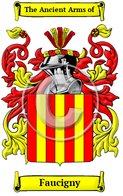 The surname Faucigny was first found in Switzerland, where the name came from the province of Vaud from a distinguished line which gained a significant reputation for its contribution to the emerging mediaeval society. It later became more prominent as many branches of the same house acquired distant estates and branches, some in foreign countries, always elevating their social status by their great contributions to society.