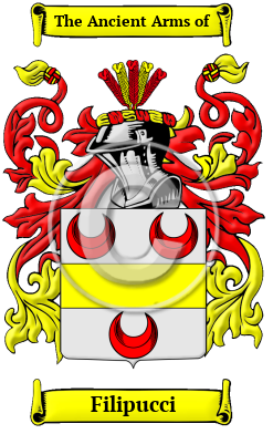 | Filipucci History, Family Crest & Coats of Arms Etymology of FilipucciWhat does the name Filipucci mean? The Italian surname Filipucci is a patronymic name created from the first name of a male ancestor. As a first name, it is derived from the Latin "Philippus," which is in turn derived from the Greek "Philipp•s." This name is composed of the element "philos" which means "friend," and "hippos," meaning "horse." Thus the surname literally means "son of one who is a lover of horses." This name became common throughout Europe due to several saints and monarchs who bore the name. Early Origins of the Filipucci familyThe surname Filipucci was first found in the ancient city of Arcevia, where a record from 1238 showed a Corrado di Filippino, who owned Castle Montesecco. Early History of the Filipucci familyThis web page shows only a small excerpt of our Filipucci research. Another 72 words (5 lines of text) covering the years 1457, 1536, 1574, 1602, 1625, 1830 and 1859 are included under the topic Early Filipucci History in all our PDF Extended History products and printed products wherever possible. Filipucci Spelling VariationsSpelling variations of this family name include: Filippi, Filippo, Filippa, Filpo, Filpi, Firpo, Filippino, Filipi, Filipucci, Filipipi, Firpi, De Filippo, De Filippi, De Filippis, Di Filippo, Filipovich, Filipcic, Filippelli, Filippello, Filippetti, Filippini, Filippucci, Filippozzi, Filipponi, Filippone, Filippazzo, Filippaz, Filipaz, Filipas, Filippanio, Filippato and many more. Early Notables of the Filipucci family- Gaspare Filipi was a composer during the 17th century, and was Choirmaster of the Vincenza Cathedral. Also at this time was Father Stefano Filippini, an organist and composer of church music. Agostino...
