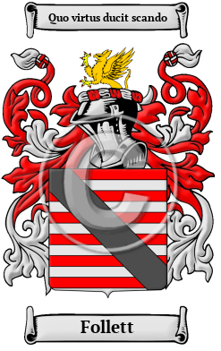 | Follett History, Family Crest & Coats of Arms Etymology of FollettWhat does the name Follett mean? The Follett surname comes from the Old French word "fol," meaning "mad," or "stupid." This in turn comes from the Latin word "follis" which formerly referred to anything filled with air, but which later took on metaphorical connotation of vanity. As a surname, it was most likely a nickname for a free-spirited or eccentric person, which was later adopted as a hereditary surname. Early Origins of the Follett familyThe surname Follett was first found in Kent where they held a family seat from early times. The earliest record found of the name in Britain, is in the Domesday Book of 1086, which shows a William Folet in Kent. Follett may be descended from a family, which originated in Cotentin, in western Normandy. Of this line was Sampson Foliot, Seigneur, (or Lord) of Montfarville, near Cherbourg. Early History of the Follett familyThis web page shows only a small excerpt of our Follett research. Another 109 words (8 lines of text) covering the years 1100, 1147, 1158 and 1599 are included under the topic Early Follett History in all our PDF Extended History products and printed products wherever possible. Follett Spelling VariationsAnglo-Norman names are characterized by a multitude of spelling variations. When the Normans became the ruling people of England in the 11th century, they introduced a new language into a society where the main languages of Old and later Middle English had no definite spelling rules. These languages were more often spoken than written, so they blended freely with one another. Contributing to this mixing of tongues was the fact that medieval scribes spelled words according to sound, ensuring that a person's name would appear differently in nearly every document in which it was recorded. The name has been spelled Folet, Follet, Follett and others. Early Notables of the Follett familyMore information is included under the topic Early Follett Notables in all our PDF Extended History products and printed products wherever possible. Follett World Rankingthe United States, the name Follett is the 9,135th most popular surname with an estimated 2,487 people with that name. 1 However, in Newfoundland, Canada, the name Follett is ranked the 278th most popular surname with an estimated 160 people with that name. 2 Migration of the Follett family to IrelandSome of the Follett family moved to Ireland, but this topic is not covered in this excerpt. Another 33 words (2 lines of text) about their life in Ireland is included in all our PDF Extended History products and printed products wherever possible.