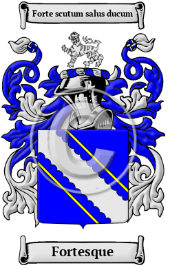 | Fortesque History, Family Crest & Coats of Arms Etymology of FortesqueWhat does the name Fortesque mean? The ancient name Fortesque is a Norman name that would have been developed in England after the Norman Conquest of England in 1066. This name was a name given to a valiant or strong warrior. This name is composed of the Old French elements, fort, which means strong, and escu, which means shield. Sir Richard le Forte was one of the leaders of the Norman army at Hastings. He was a great fighter and protected Duke William by holding a large shield or escue in front of him, hence Fortescue. The motto of the family, "Forte Scutum salus ducum," meaning 'a strong shield is the safety of commanders,' attests to the family's founder. 1 Early Origins of the Fortesque familyThe surname Fortesque was first found in Devon at Wymodeston (later called Winston) in the parish of Modbury in the year 1209. 2 3 This was "the most ancient seat of the Fortescues, in whose possession it continued from the days of King John to the Reign or Queen Elizabeth." 2 A current search for Winston in Devon returns nothing other than a reference to Winston Manor. However, the parish of Modbury is today in the South Hams region. "In Filleigh [Devon] is Castle Hill, the seat of Earl Fortescue, the representative of this most ancient and distinguished family, whose surname, as in their motto, Forte scutum, salus ducum, is said to signify a 'strong shield.' The common ancestor was settled at Wimpston or Wymondeston in Modbury, which, according to the family tradition, was given to Richard le Forte, shield-bearer to the Conqueror, for his good services at Hastings. John Fortescue was settled at Wimpston in 1209 ; and the elder branch continued to live there until early in the seventeenth century. The family branched out from Wimpston to Preston, Spriddleston, Shipham, Wood, Fallapit, Wear Giffard, Filleigh, and Buckland Filleigh in Devon, and settled also in Cornwall, Hertford, Essex, Buckingham, and Ireland." 4 "Salcombe Castle was the last place in Devon which adhered to the cause of Charles I. The Castle dates from the reign of Henry VIII., and was one of the numerous little strengths built by him on the Western coasts to defend the principal ports from sudden forays. Sir Edmund Fortescue of Fallapit, the Royalist High Sheriff of Devon in 1642, and for many months a prisoner at Winchester House and Windsor Castle, on his release undertook to re fortify and man the ancient walls. Prince Maurice gave him a commission for this purpose in December, 1643, while he was engaged in the siege of Plymouth; and Fortescue evidently carried out his work thoroughly. " 4 Early History of the Fortesque familyThis web page shows only a small excerpt of our Fortesque research. Another 196 words (14 lines of text) covering the years 1394, 1442, 1461, 1476, 1531, 1535, 1539, 1578, 1580, 1581, 1607, 1621, 1659, 1665, 1666, 1689, 1695, 1698, 1719 and 1797 are included under the topic Early Fortesque History in all our PDF Extended History products and printed products wherever possible. Fortesque Spelling VariationsBefore the last few hundred years the English language had no fixed system of spelling rules. For that reason, spelling variations occurred commonly in Anglo Norman surnames. Over the years, many variations of the name Fortesque were recorded, including Fortescue, Fortesque and others. Early Notables of the Fortesque familySir John Fortescue (c.1394-1476), the English jurist. A supporter of the Lancastrian king Henry VI, he was chief justice of the Court of King's Bench from 1442 until 1461.