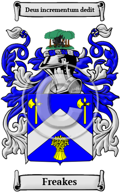 | Freakes History, Family Crest & Coats of Arms Early Origins of the Freakes familyThe surname Freakes was first found in Norfolk where Richard de la Fryth was recorded in the Hundredorum Rolls of 1273 in Norfolk. 1 Another source lists John atte Frithe in Norfolk but no date is given. 2 Later, the Yorkshire Poll Tax Rolls of 1379 listed Thomas atte Fryth. 1 "Robert Firth was the name of two mayors of Doncaster [Yorkshire] in the reigns of Henry VII. and Henry VIII., and the name is still in the town." 3 Further to the north in Scotland where most people claim descent, "there is a place named Firth near Lilliesleaf, Roxburghshire." 4 The name of this town in turn comes from the ancient word "firth" meaning "bay." Early History of the Freakes familyThis web page shows only a small excerpt of our Freakes research. Another 169 words (12 lines of text) covering the years 1379, 1522, 1565, 1606 and 1630 are included under the topic Early Freakes History in all our PDF Extended History products and printed products wherever possible. Freakes Spelling VariationsAlthough the name, Freakes, appeared in many references, from time to time, the surname was shown with the spellings Firth, Fyrth, Firthe, Firths and others. Early Notables of the Freakes familyMore information is included under the topic Early Freakes Notables in all our PDF Extended History products and printed products wherever possible. Migration of the Freakes familyGradually becoming disenchanted with life in Ireland many of these uprooted families sailed aboard the armada of sailing ships known as the "White Sails" which plied the stormy Atlantic. These overcrowded ships often arrived with only 60 to 70% of their original passenger list, many dying of cholera, typhoid, dysentery or small pox. In North America, some of the first immigrants who could be considered kinsmen of the Freakes family name Freakes, or who bore a variation of the surname were Isaac Firth who landed in America in 1698; Elizabeth Firth settled in Maryland in 1722; George Firth settled in Nova Scotia in 1774; Albert, B.G. Barker, Charles, Daniel, Greenwood, Henry, James, John, Joseph, Richard, Samuel, Thomas and William Firth, all settled in Philadelphia, Pennsylvania between 1805 and 1874. In Newfoundland, Gideon Firth settled in Harbour Grace in 1771.