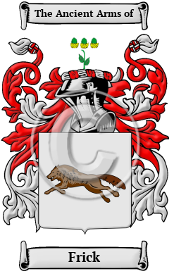 | Frick History, Family Crest & Coats of Arms Early Origins of the Frick familyThe surname Frick was first found in Germany, where the name Frick came from humble beginnings but gained a significant reputation for its contribution to the emerging mediaeval society. It later became more prominent as numerous branches of the same house acquired distant estates, some of which were located in other countries. Through the acquisition of these estates as well as their important contributions to society, the family successfully elevated their social status. Like many surnames, the name Frick is taken from a personal name which was very common at the time. Frick is a shortened form of Frederick, which is composed of the Germanic elements "fred," meaning "peace" and "ric," meaning "power." Like many personal names of the time, it owed its popularity to the fact that there was a saint by that name; Saint Frederick was the Bishop of Utrecht (in modern-day Holland) and worked to end paganism and idolatry. Early History of the Frick familyThis web page shows only a small excerpt of our Frick research. Another 74 words (5 lines of text) covering the years 1740, 1769, 1780, 1786 and 1798 are included under the topic Early Frick History in all our PDF Extended History products and printed products wherever possible. Frick Spelling VariationsSpelling variations of this family name include: Frick, Fricke, Fricker, Frickel, Frickes, Fricks and others. Early Notables of the Frick family- Philipp Joseph Frick or Frike, born near Würzburg May 27, 1740, originally organist to the Margrave of Baden, remarkable performer on the Harmonica...