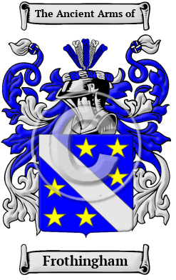 England Early Origins of the Frothingham familyThe surname Frothingham was first found in Yorkshire where they held a family seat as Lords of the Manor. The Saxon influence of English history diminished after the Battle of Hastings in 1066. The language of the courts was French for the next three centuries and the Norman ambience prevailed. But Saxon surnames survived and the family name was first referenced in the 12th century when they held estates at South Frodingham. Early History of the Frothingham familyThis web page shows only a small excerpt of our Frothingham research. Another 125 words (9 lines of text) covering the years 1394, 1415, 1429, 1455, 1487, 1510 and 1600 are included under the topic Early Frothingham History in all our PDF Extended History products and printed products wherever possible. Frothingham Spelling VariationsSpelling variations in names were a common occurrence before English spelling was standardized a few hundred years ago. In the Middle Ages, even the literate spelled their names differently as the English language incorporated elements of French, Latin, and other European languages. Many variations of the name Frothingham have been found, including Frodingham, Fordingham, Frothingham, Froddingham and others. Early Notables of the Frothingham familyMore information is included under the topic Early Frothingham Notables in all our PDF Extended History products and printed products wherever possible.