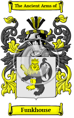 The ancient and distinguished surname Funkhouse is of German origin. It is derived from the Middle High German "funke," meaning "spark," and was most likely originally used to denote a blacksmith. Alternatively, it may have originally been bestowed as a nickname to indicate a very lively person.