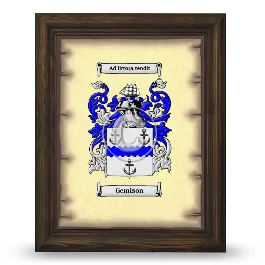 A classic solid wood brown frame with a Coat of Arms and Family Crest most commonly associated with your family's surname. Includes family crest and motto where available!