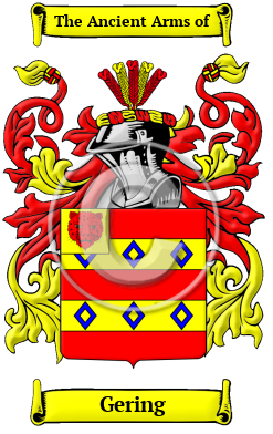 | Gering History, Family Crest & Coats of Arms Early Origins of the Gering familyThe surname Gering was first found in Cambridgeshire where they held a family seat as Lords of the Manor. The Saxon influence of English history diminished after the Battle of Hastings in 1066. The language of the courts was French for the next three centuries and the Norman ambience prevailed. But Saxon surnames survived and the family name was first referenced in the 13th century when they held estates in that shire. Early History of the Gering familyThis web page shows only a small excerpt of our Gering research. Another 99 words (7 lines of text) covering the years 1270, 1273, 1327, 1455 and 1487 are included under the topic Early Gering History in all our PDF Extended History products and printed products wherever possible. Gering Spelling VariationsSpelling variations of this family name include: Gering, Gerring, Gerrin, Gerin, Gearing, Gearin, Geryn, Geryng and many more. Early Notables of the Gering familyMore information is included under the topic Early Gering Notables in all our PDF Extended History products and printed products wherever possible.