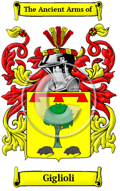 The surname Giglioli was first found in Ferrara, a city and comune in Emilia-Romagna, northern Italy, capital city of the Province of Ferrara. History dates the city back to 753. It was at war with Venice in 1471. It is a walled city and notable is the Church of S.Cristoforo. Knitted goods and shawls are made. In those ancient times only persons of rank, the podesta, clergy, city officials, army officers, artists, landowners were entered into the records. To be recorded at this time was in itself a family honor. The Giglio family originated in Pellicciari but little is known of their early history. They became seated in Ferrara in 1184 during the Norman occupation.