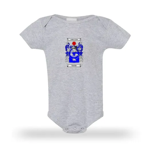 Our classic baby one-piece is now available in grey! The Coat of Arms and Family Crest are heat pressed on the front of the onesie. Offered at a great value, you will not be disappointed. Incredibly soft material with a three snap closure for easy changes. Perfect for the youngest members of your family!
