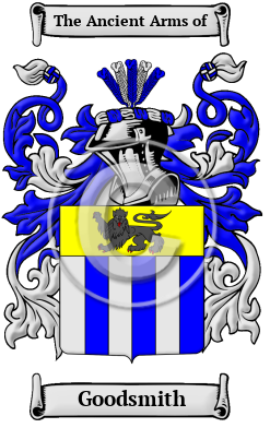 | Goodsmith History, Family Crest & Coats of Arms Etymology of GoodsmithWhat does the name Goodsmith mean? The name Goodsmith is from the ancient Anglo-Saxon tribes of Britain. The name was given to a person who was a goldsmith, jeweler. The name denoted "one who made or sold gold articles, a jeweler, later a banker." 1 Early records may show the name in the Latin-French version "Aurifaber." 2 Early French revealed "Geoffry, Roger, William, Nicholas. Gerard Aurifaber (Goldsmith) of Normandy 1180-95, three more in 1198 in the Magni Rotuli Scaccarii Normanniae. 3 "The great value of the commodity in which the medieval goldsmith dealt rendered him a person of consequence. No less than three tenants-in-chief under the Conqueror arc entered in Domesday under the name of Aurifaber. One of these, Otto Aurifaber, held in Essex, and his descendants, under the surname of Fitz-Otho, appear to have been hereditary mint-masters to the crown for two centuries, becoming extinct in 1282. Kelham. The equivalent French Orfevre, and the German Goldschmid, are well-known surnames." 4 Early Origins of the Goodsmith familyThe surname Goodsmith was first found in Norfolk where Roger Goldsmiz was listed in 1250. Thomas Goldsmith was listed in the Assize Rolls for Essex in 1255 and later John le Goldesmethe was listed in Devon in 1309. 5 The Hundredorum Rolls recorded the name in the Latin form: Geoffrey Aurifaber, Salop (Shropshire); and Walter Aurifaber, Oxfordshire. 2 Richard le Goldsmythe, was listed 1 Edward III (during the first year of King Edward III's reign) in Somerset. 6 The Yorkshire Poll Tax Rolls of 1379 listed Thomas Goldsmyth, goldsmyth, of Wakefield; Johannes filius Gallridi, goldsmyth; Hugo Goldsmyth; and Agnes Goldsmvche. 2 Further to the north in Scotland, the records were first in the Latin form and later changed to the more contemporary spellings. "William Aurifaber witnessed a gift of land to the Hospital of Soltre c. 1250-1266. Ewgenius (Ewen) Aurifaber was one of an inquest at Dumbarton in 1271, and Martin Aurifaber appears as burgess of Aberdeen in 1281. Walter Aurifaber, burgess of Roxburgh in 1285 is doubtless "Walter the goldsmith, burgess and alderman of Roxburgh," who rendered homage in 1296. Rogier le orfeure of Berwick, also rendered homage in 1296. John Goldsmith (aurifaber) was bailie of Edinburgh in 1342 and rendered to Exchequer the accounts of the city." 7 The two entries of "rendered homage" refers to them having "renerderd homage" to King Edward I during his attempt to conquer Scotland. Early History of the Goodsmith familyThis web page shows only a small excerpt of our Goodsmith research. Another 91 words (6 lines of text) covering the years 1426, 1427, 1453, 1472, 1481, 1488, 1494, 1613, 1629 and 1655 are included under the topic Early Goodsmith History in all our PDF Extended History products and printed products wherever possible. Goodsmith Spelling VariationsSound was what guided spelling in the essentially pre-literate Middle Ages, so one person's name was often recorded under several variations during a single lifetime. Also, before the advent of the printing press and the first dictionaries, the English language was not standardized. Therefore, spelling variations were common, even among the names of the most literate people. Known variations of the Goodsmith family name include Goldsmith, Goldsmyth and others. Early Notables of the Goodsmith familyFrancis Goldsmith (1613-1655), English translator of Grotius, born on 25 March 1613, son and heir of Francis Goldsmith of St. Giles's-in-the-Fields, Middlesex, and grandson of Sir Francis Goldsmith of Crayford, Kent. "He became a gentleman-commoner of Pembroke College, Oxford, in 1629, but... Another 41 words (3 lines of text) are included under the topic Early Goodsmith Notables in all our PDF Extended History products and printed products wherever possible. Migration of the Goodsmith family to IrelandSome of the Goodsmith family moved to Ireland, but this topic is not covered in this excerpt. Another 34 words (2 lines of text) about their life in Ireland is included in all our PDF Extended History products and printed products wherever possible. Migration of the Goodsmith familyFor political, religious, and economic reasons, thousands of English families boarded ships for Ireland, the Canadas, the America colonies, and many of smaller tropical colonies in the hope of finding better lives abroad. Although the passage on the cramped, dank ships caused many to arrive in the New World diseased and starving, those families that survived the trip often went on to make valuable contributions to those new societies to which they arrived. Investigation of the origins of family names on the North American continent has revealed that early immigrants bearing the name Goodsmith or a variant listed above: Arthur Goldsmith who purchased land and settled in Virginia in 1618; William settled in Barbados in 1654; Richard, Lewis, Joseph, Henry and Morris all settled in Philadelphia between 1822 and 1878.