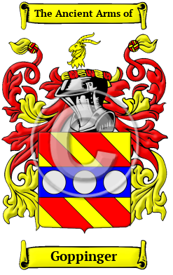 | Goppinger History, Family Crest & Coats of Arms Etymology of GoppingerWhat does the name Goppinger mean? Goppinger is an ancient Norman name that arrived in England after the Norman Conquest of 1066. The Goppinger family lived in Suffolk which is derived from the Old English copp, a word for the top or summit of a hill, and indicates someone who lived in such a place. Another reference presumes that the name was derived from the word "coppin," which was a "piece of yarn taken from a spindle." 1 The Suffolk expression "To live like a Coppinger, points to the wealth and hospitality of a family of this name who flourished in the 16th and 17th century at Buxhall." 1 Early Origins of the Goppinger familyThe surname Goppinger was first found in Suffolk where they held a family seat from very early times. Records from the year 1290 showed Greffrey Coppinger and Walter Coppinger in Waketown, Norfolk. Roger Coppinger of Waketun is listed in Norfolk in that same era, in the Rotuli Hundredorum. Other early records of the name include Seman Copinger, listed in the Subsidy Rolls of Suffolk in 1327; William Copenger listed in the Feet of Fines of Suffolk in 1383; and William Copynger, listed in the Feet of Fines of Essex in 1489. 2 Early History of the Goppinger familyThis web page shows only a small excerpt of our Goppinger research. Another 180 words (13 lines of text) covering the years 1319, 1411, 1412, 1415, 1416, 1436, 1503, 1512, 1513, 1532, 1547, 1583, 1592, 1603, 1604, 1621, 1626, 1646, 1659, 1675 and 1797 are included under the topic Early Goppinger History in all our PDF Extended History products and printed products wherever possible. Goppinger Spelling VariationsNorman surnames are characterized by a multitude of spelling variations. The frequent changes in surnames are largely due to the fact that the Old and Middle English languages lacked definite spelling rules. The introduction of Norman French to England, as well as the official court languages of Latin and French, also had pronounced influences on the spelling of surnames. Since medieval scribes and church officials recorded names as they sounded, rather than adhering to any specific spelling rules, it was common to find the same individual referred to with different spellings. The name has been spelled Coppinger, Coppenger, Copenger, Copinger, Coppynger, Copinsher and many more. Early Notables of the Goppinger familyWilliam Copinger (d. 1436), who became the parson (rector) of Buxhall in 1416. He was a member of a family settled at Buxhall, Suffolk. His will is dated 20 Jan. 1411-1412, and was proved on 2 March 1415-1416. He was buried at Buxhall. 3