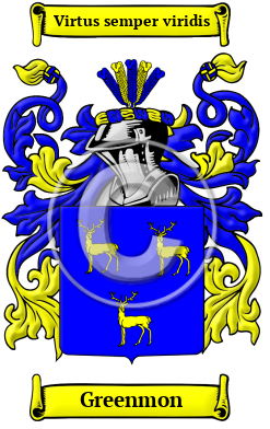 | Greenmon History, Family Crest & Coats of Arms Etymology of GreenmonWhat does the name Greenmon mean? The origins of the Greenmon name lie with England's ancient Anglo-Saxon culture. It comes from when the family lived in the village greene which was the center or main square of each region. It is derived from the Old English "grene," meaning "green," and was most likely first borne by a family who lived in the village greene, the center or main square of a region. Alternatively, it may have been bestowed as a nickname on someone who was particularly fond of dressing in green. 1 Early Origins of the Greenmon familyThe surname Greenmon was first found in Kent, where the earliest record of the name was Geoffrey Greene who was recorded in a Poll Tax in 1188. As every early English village had a green, the surname Greenmon emerged independently in many different places during the Middle Ages, thus creating several early branches of the Greenmon family. Richard de la Grene was listed in the Pipe Rolls of Norfolk in 1200 and Geoffrey Attegrene was listed in the Assize Rolls of Lancashire in 1206. 2 The prefix "atte" was a popular namesake which meant in this case "at the green." 1 Years later, the Hundredorum Rolls of 1273 list Deonisia ate Grene and Warin de la Grene; while the Yorkshire Poll Tax Rolls of 1379 list Petnis del Grene and Adam del Grene, as holding lands there at that time. 3 Records in Scotland were very scarce, but we did find "Roger del ('of the') Grene in Roxburghshire [who] rendered homage in 1296 [to King Edward I of England]. Master John Grene, [was] Chancellor of Moray, 1463." 4 Early History of the Greenmon familyThis web page shows only a small excerpt of our Greenmon research. Another 84 words (6 lines of text) covering the years 1221, 1461, 1462, 1506, 1558, 1592, 1614, 1620, 1630, 1636, 1679, 1685, 1690, 1700, 1702, 1705, 1708 and 1890 are included under the topic Early Greenmon History in all our PDF Extended History products and printed products wherever possible. Greenmon Spelling VariationsBefore the last few hundred years, the English language had no fast system of spelling rules. For that reason, spelling variations are commonly found in early Anglo-Saxon surnames. Over the years, many variations of the name Greenmon were recorded, including Greene, Green, Grene, Grean and others. Early Notables of the Greenmon familySir Thomas de Green (c.1461-1506), Lord of Greens Norton, received Boughton, Greens Norton, and large monetary grants through his inheritance upon the death of his father in 1462; Dr. John Green, the Bishop of Lincoln; Sir William Greene of Oxford, Alderman Greene of Chester; Robert Greene (1558-1592), English dramatist; John Henry Green (1636-1685), an English physician and philanthropist from London; John Greene Jr... Another 62 words (4 lines of text) are included under the topic Early Greenmon Notables in all our PDF Extended History products and printed products wherever possible. Migration of the Greenmon family to IrelandSome of the Greenmon family moved to Ireland, but this topic is not covered in this excerpt. Another 123 words (9 lines of text) about their life in Ireland is included in all our PDF Extended History products and printed products wherever possible. Migration of the Greenmon familyTo escape oppression and starvation at that time, many English families left for the "open frontiers" of the New World with all its perceived opportunities. In droves people migrated to the many British colonies, those in North America in particular, paying high rates for passages in cramped, unsafe ships. Although many of the settlers did not make the long passage alive, those who did see the shores of North America perceived great opportunities before them. Many of the families that came from England went on to make essential contributions to the emerging nations of Canada and the United States. Research into various historical records revealed some of first members of the Greenmon family emigrate to North America: Aderton Greene, who came to Virginia in 1623; John Greene, who settled in Boston in 1625; Abigail Greene, who arrived in Boston, Massachusetts in 1632.