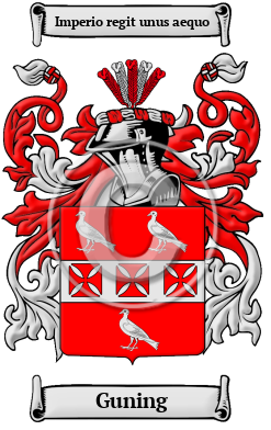 | Guning History, Family Crest & Coats of Arms Etymology of GuningWhat does the name Guning mean? Guning is an ancient Anglo-Saxon name that is derived from Gunwyn deriving its origin from the Old English gundwein, which meant "battle friend" or in some cases, as a baptismal name as in "the son of Gunwyn." 1 Early Origins of the Guning familyThe surname Guning was first found in Suffolk where "in Corton (Suffolk) in the reign of John, Gundewyn' de Nethergate held land which was held in 1275 by Gerald Gunwine or Gundwyne by heredity." 2 Gundewinus cortinarius was listed in the Pipe Rolls of Surrey in 1130. From this early Latin entry, Thomas Gundewin was found in the Close Rolls of 1228 and William Gundewyne was later listed in the Subsidy Rolls of Sussex in 1296. 2 The Yorkshire Poll Tax Rolls of 1379 had only one listing, Willelmus Gunwyn as holding lands there at that time. 1 Early History of the Guning familyThis web page shows only a small excerpt of our Guning research. Another 60 words (4 lines of text) covering the years 1614, 1615, 1661, 1670, 1674, 1675, 1684, 1731, 1734, 1765, 1771, 1772, 1774, 1776, 1798, 1816 and 1890 are included under the topic Early Guning History in all our PDF Extended History products and printed products wherever possible. Guning Spelling VariationsGuning has been spelled many different ways. Before English spelling became standardized over the last few hundred years, spelling variations in names were a common occurrence. As the English language changed in the Middle Ages, absorbing pieces of Latin and French, as well as other languages, the spelling of people's names also changed considerably, even over a single lifetime. Many variations of the name Guning have been found, including Gunning, Guning and others. Early Notables of the Guning familyPeter Gunning (1614-1684), an English Royalist church leader, Bishop of Chichester (1670-1675) and Ely (1675-1684), Master of Corpus Christi College, Cambridge (1661.) He was son of Peter Gunning (d. 1615), vicar of Hoo, Kent, whose brother Richard settled in Ireland and was ancestor of Sir Robert Gunning (1731-1816), the Irish... Another 49 words (4 lines of text) are included under the topic Early Guning Notables in all our PDF Extended History products and printed products wherever possible. Migration of the Guning family to IrelandSome of the Guning family moved to Ireland, but this topic is not covered in this excerpt. Another 95 words (7 lines of text) about their life in Ireland is included in all our PDF Extended History products and printed products wherever possible. Migration of the Guning familyIn an attempt to escape the chaos experienced in England, many English families boarded overcrowded and diseased ships sailing for the shores of North America and other British colonies. Those families hardy enough, and lucky enough, to make the passage intact were rewarded with land and a social environment less prone to religious and political persecution. Many of these families became important contributors to the young colonies in which they settled. Early immigration and passenger lists have documented some of the first Gunings to arrive on North American shores: John Gunning, who settled in Barbados in 1680 with his servants; John Gunning settled in Philadelphia in 1836; and another John Gunning settled in Salem Massachusetts in 1799.