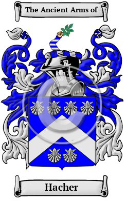 England France Etymology of HacherWhat does the name Hacher mean? The ancestry of the name Hacher dates from the ancient Anglo-Saxon culture of Britain. It comes from when the family lived near a hatch or gate which in most cases led to a forest, but occasionally led to a sluice. 1 The surname Hacher is derived from the Old English word hæcce, which means hatch. 2 The surname Hacher belongs to the class of topographic surnames, which were given to people who resided near physical features such as hills, streams, churches, or types of trees. Early Origins of the Hacher familyThe surname Hacher was first found in Sussex where the Subsidy Rolls of 1296 list John Hetchere as holding lands there at that time. 3 Later, a branch of the family was found in Lincolnshire where they held the Manor of Carby. Early History of the Hacher familyThis web page shows only a small excerpt of our Hacher research. Another 56 words (4 lines of text) covering the years 1583, 1589, 1624, 1634, 1659, 1660, 1677 and 1678 are included under the topic Early Hacher History in all our PDF Extended History products and printed products wherever possible. Hacher Spelling VariationsSpelling variations in names were a common occurrence before English spelling was standardized a few hundred years ago. In the Middle Ages, even the literate spelled their names differently as the English language incorporated elements of French, Latin, and other European languages. Many variations of the name Hacher have been found, including Hacher, Hatcher, Hatchers and others. Early Notables of the Hacher familyColonel Francis Hacker (died 1660), an English soldier who fought for Parliament during the English Civil War, one of the Regicides of King Charles I of England.
