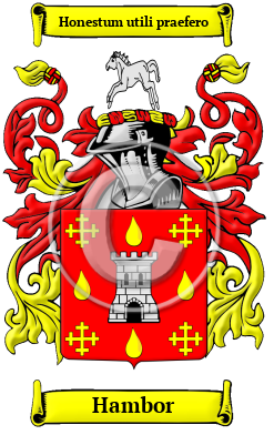 | Hambor History, Family Crest & Coats of Arms Etymology of HamborWhat does the name Hambor mean? Hambor is a name whose history is connected to the ancient Anglo-Saxon tribes of Britain. The name is derived from when the Hambor family once lived in the parish of Hanbury in the county of Oxford. 1 Henry de Hambury (fl. 1330), was an early English judge, the a son of Geoffrey de Hambury of Hambury or Hanbury in Worcestershire. 2 He was being briefly Lord Chief Justice of Ireland. Early Origins of the Hambor familyThe surname Hambor was first found in Oxfordshire and Gloucestershire, where evidence suggests they held a family seat before the Norman Conquest. Hambrook is a village and hamlet in the parish of Winterbourne, South Gloucestershire. Whereras, Handbrough is a parish, in the union of Witney, hundred of Wootton in the county of Oxford. Both villages have remained small through the ages. Hambrook had about 600 inhabitants and Handbrough (Hanborough) had about 1,000 inhabitants as of a census in the late 1800s. The latter villages dates back to at least the Domesday Book where it was listed as Haneberge 3 and literally meant "hill of a man called Hagena or Hana" derived from the Old English personal name + beorg. Hambrook also dates back to the Domesday Book where it was listed as Hanbroc. 3 In this case, the village literally meant "brook by the stone" from the Old English han + broc. 4 Early History of the Hambor familyThis web page shows only a small excerpt of our Hambor research. Another 153 words (11 lines of text) covering the years 1086, 1273 and 1330 are included under the topic Early Hambor History in all our PDF Extended History products and printed products wherever possible. Hambor Spelling VariationsSound was what guided spelling in the essentially pre-literate Middle Ages, so one person's name was often recorded under several variations during a single lifetime. Also, before the advent of the printing press and the first dictionaries, the English language was not standardized. Therefore, spelling variations were common, even among the names of the most literate people. Known variations of the Hambor family name include Hambro, Hambrow, Hambury, Hamborough, Hamboro and others. Early Notables of the Hambor familyAnother 43 words (3 lines of text) are included under the topic Early Hambor Notables in all our PDF Extended History products and printed products wherever possible. Migration of the Hambor family to IrelandSome of the Hambor family moved to Ireland, but this topic is not covered in this excerpt. More information about their life in Ireland is included in all our PDF Extended History products and printed products wherever possible. Migration of the Hambor familyFor political, religious, and economic reasons, thousands of English families boarded ships for Ireland, Canada, the America colonies, and many of smaller tropical colonies in the hope of finding better lives abroad. Although the passage on the cramped, dank ships caused many to arrive in the New World diseased and starving, those families that survived the trip often went on to make valuable contributions to those new societies to which they arrived. Early immigrants bearing the Hambor surname or a spelling variation of the name include: Daniel Hanbury who sailed to Massachusetts in 1635; Peter Hanbury to Virginia in 1639; Peter Hambro, to Philadelphia, Pa. in 1750; Benjamin Hambury to Virginia in 1774.
