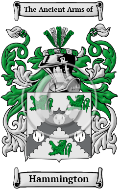 England Early Origins and Etymology of HammingtonThe surname Hammington was first found in Hannington, a parish, in the union of Brixworth, hundred of Orlingbury Northamptonshire. Literally the place name means "estate associated with a man called Hana," from the Old English personal name + "-ing" + "tun." 1 There are two other parishes so named, one in Southampton and the other in Wiltshire, but the Northamptonshire parish is the one that the family originates for this one dates back to before the Conquest when it was first listed as Hanningtun in 1023. The Domesday Book of 1086 listed the place as Hanitune. It also includes an entry for Alfuuin de Haminteuna, de Haningtuna, de Hanningetuna. Almost one hundred years later, John de Haninton was listed in the Pipe Rolls of Hampshire in 1176. 2 "In a charter of A.D. 1023 Hannington (Hants) occurs as Hanningtun in the Latin portion and as Hanittún (tó Hanitúne) in the Anglo-Saxon (boundaries) part. " 3 Adam de Hanington was listed in Westmorland, 30 Edward III (during the 30th year of King Edward III's reign.) 4 Early History of the Hammington familyThis web page shows only a small excerpt of our Hammington research. Another 112 words (8 lines of text) covering the years 1106, 1176, 1432, 1510, 1600, 1627 and 1704 are included under the topic Early Hammington History in all our PDF Extended History products and printed products wherever possible. Hammington Spelling VariationsThe English language only became standardized in the last few centuries; therefore,spelling variations are common among early Anglo-Saxon names. As the form of the English language changed, even the spelling of literate people's names evolved. Hammington has been recorded under many different variations, including Hannington, Hammington, Hanington, Haninton, Haminton, Hamigston, Hanyington, Hannyngton, Haninston and many more. Early Notables of the Hammington familyMore information is included under the topic Early Hammington Notables in all our PDF Extended History products and printed products wherever possible. Migration of the Hammington familyFor many English families, the political and religious disarray that shrouded England made the far away New World an attractive prospect. On cramped disease-ridden ships, thousands migrated to those British colonies that would eventually become Canada and the United States. Those hardy settlers that survived the journey often went on to make important contributions to the emerging nations in which they landed. Analysis of immigration records indicates that some of the first North American immigrants bore the name Hammington or a variant listed above: the name represented in many forms and recorded from the mid 17th century in the great migration from Europe. Migrants settled in the eastern seaboard from Newfoundland, to Maine, to Virginia, the Carolinas, and to the islands..