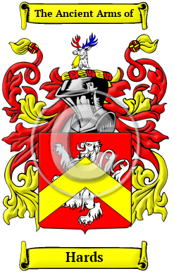 England Etymology of HardsWhat does the name Hards mean? The Hards name has descended through the generations from the ancient Anglo-Saxon culture. Their name comes from having lived in Upper Hardres or Lower Hardres, near Canterbury referred to as Hardres. Both parishes dates back to Saxon times where they were collectively known as Haredum in 785. 1 By the Domesday Book of 1086, the parishes were known as Hardes. 2 The place names literally mean "place at the woods," from the Old English "harad." 1 Early Origins of the Hards familyThe surname Hards was first found in Kent, where family members were Lords of the manor Lyminge. The earliest recorded ancestor is Robert de Hardres, who lived during the reigns of Edward the Confessor and William the Conqueror. He held his lands from the Archbishop of Canterbury, which consisted of a church, a mill, and a fishery of forty eels, as recorded in the Domesday Book. 2 "There are two parishes in that county so called, and Hardres Court was the family seat down to the extinction of the baronetcy in 1764. The family derived from Ardres in Picardy and conferred their name upon the Kentish localities-a circumstance of rare but not of unique occurrence. "3 The Hundredorum Rolls of 1273 had two listings for the family, both in Kent: Gunnora de Hardres; and Robert de Hardres. 4 Early History of the Hards familyThis web page shows only a small excerpt of our Hards research. Another 195 words (14 lines of text) covering the years 1606, 1610, 1635, 1642, 1660, 1664, 1669, 1673, 1676, 1679, 1681, 1686, 1688, 1718, 1736 and 1764 are included under the topic Early Hards History in all our PDF Extended History products and printed products wherever possible. Hards Spelling VariationsOnly recently has spelling become standardized in the English language. As the English language evolved in the Middle Ages, the spelling of names changed also. The name Hards has undergone many spelling variations, including Hardress, Hardres, Hardresse, Hardrese, Harders and many more. Early Notables of the Hards familySir Richard Hadres of Kent, Baronet, who was buried in London in 1676; and Sir Thomas Hardres (1610-1681), an English barrister and politician, Member of Parliament for Canterbury, Kent (1664), King's Serjeant (1679). He was descended from an old family possessed... Another 41 words (3 lines of text) are included under the topic Early Hards Notables in all our PDF Extended History products and printed products wherever possible.