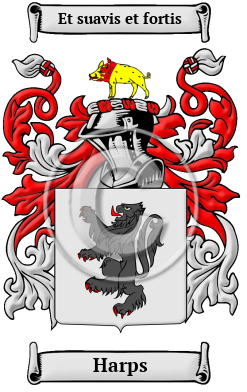 | Harps History, Family Crest & Coats of Arms Etymology of HarpsWhat does the name Harps mean? The ancestors of the name Harps are thought to have come from the ancient Scottish kingdom of Dalriada. Harps was used to indicate someone who worked as a person who occupies the role of "harper". In ancient times the harper was considered an important figurehead whereby Brehon laws stated that the elegance and music of the harp "deserved" a noble status. "In some districts lands were attached to the office as shown by the place names Croit a' Chlarsair, 'the Harper's Croft,' in the parish of Kiltarlity, near Dundonald, Ayrshire, and elsewhere, and the lands of Harperfield in the parish of Lesmahagow are probably of the same origin. " 1 Early Origins of the Harps familyThe surname Harps was first found in Lennox, Scotland. Several individuals named Harper appear in the Ragman Roll as having rendered homage in 1296 to King Edward I of England: "William le Harpur of La Lawe, of the county of Edinburgh; Uctins le Harpur of the county of Lanerk, a tenant of William of Moravia; Robert le Harper of the county of Are; Johan le Harpur of the county of Berewyk, and Rogier le Harpur of Hom', also of the county of Berewyk, ere the others named in the record." 1 Farther south in England, the Hundredorum Rolls of 1273 included: Henry le Harpur, Cambridgeshire; Ralph le Harpur, Oxfordshire; and Nicholas le Harpur, Cambridgeshire. 2 In Somerset, Adam le Harper and Thomas le Harpour were both recorded there 1 Edward III (during the first year of the reign of King Edward III.) 3 The Yorkshire Poll Tax Rolls of 1379 included: Willelmus Harper; and Rogerus Harper. 2 Early History of the Harps familyThis web page shows only a small excerpt of our Harps research. Another 197 words (14 lines of text) covering the years 1100, 1496, 1566, 1574, 1579, 1585, 1603, 1616, 1638, 1639, 1645, 1669, 1679, 1680, 1681, 1700, 1741 and 1890 are included under the topic Early Harps History in all our PDF Extended History products and printed products wherever possible. Harps Spelling VariationsIn the Middle Ages, the translation between Gaelic and English was not a highly developed process. Spelling was not yet standardized, and so, an enormous number of spelling variations appear in records of early Scottish names. Harps has appeared as Harper, Harpur, Harpar, Harepur and others. Early Notables of the Harps familyHenry Harper, High Sheriff of Herefordshire in 1496; Sir William Harpur (c.1496-1574), English merchant from Bedford who moved to London, became Lord Mayor of London and in 1566 he and his wife Dame Alice created the Harpur Trust which still exists today supporting... Another 42 words (3 lines of text) are included under the topic Early Harps Notables in all our PDF Extended History products and printed products wherever possible. Migration of the Harps family to IrelandSome of the Harps family moved to Ireland, but this topic is not covered in this excerpt. Another 72 words (5 lines of text) about their life in Ireland is included in all our PDF Extended History products and printed products wherever possible.