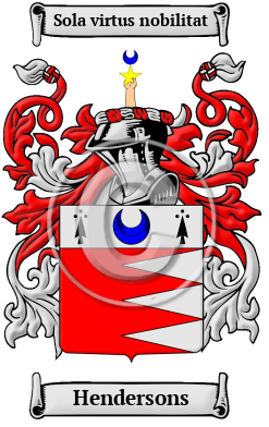 | Hendersons History, Family Crest & Coats of Arms Etymology of HendersonsWhat does the name Hendersons mean? The age-old Pictish-Scottish family name Hendersons is derived from the personal name Hendry, which is a chiefly Scottish derivative of the name Henry. There were two main branches of the Hendersons family, one at Glencoe, in the lower Highlands, and one at Caithness, in the extreme north of Scotland. Early Origins of the Hendersons familyThe surname Hendersons was first found in Caithness, Glencoe, the Shetland Islands, Liddlesdale, and Fordell. One origin claims the Hendersons family descend from Great Henry, son of King Nechtan, who was also the progenitor of the MacDonalds of Glencoe. However, the branch of the Hendersons to whom this story relates also claim to have settled in the Glencoe territory many years before the Maclains or MacDonalds arrived there. This is consistent with the theory that this family are a branch of the northern family who moved south and became attached to the MacDonalds. Generally noted as great fighters, they became bodyguards of the Chief of the MacDonalds. They were also the hereditary pipers of that Clan, sometimes referred to as the Maclains. Later, in about 1530, there emerged another section of the Henderson Clan in the Border country of Liddesdale but the connection between this group and the main Clan is somewhat tenuous. However, it is known that many of the Highland Clans were invited, coerced or transported, sometimes as a whole sometimes as a branch, to the border country to provide better defenses against English attacks along the Border. Early History of the Hendersons familyThis web page shows only a small excerpt of our Hendersons research. Another 200 words (14 lines of text) covering the years 1420, 1430, 1460, 1494, 1500, 1506, 1510, 1511, 1583, 1590, 1600, 1606, 1618, 1638, 1646, 1692 and 1865 are included under the topic Early Hendersons History in all our PDF Extended History products and printed products wherever possible. Hendersons Spelling VariationsIn the Middle ages, spelling and translation were not yet regulated by any general rules. spelling variations in names were common even among members of one family unit. Hendersons has appeared Henderson, Henreyson, Henryson, MacKendrick and many more. Early Notables of the Hendersons familyJames Henderson, of the Fordell line, who became Lord Advocate of Scotland in 1494.