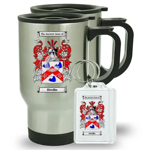 Pair of Travel Mugs and pair of Keychains