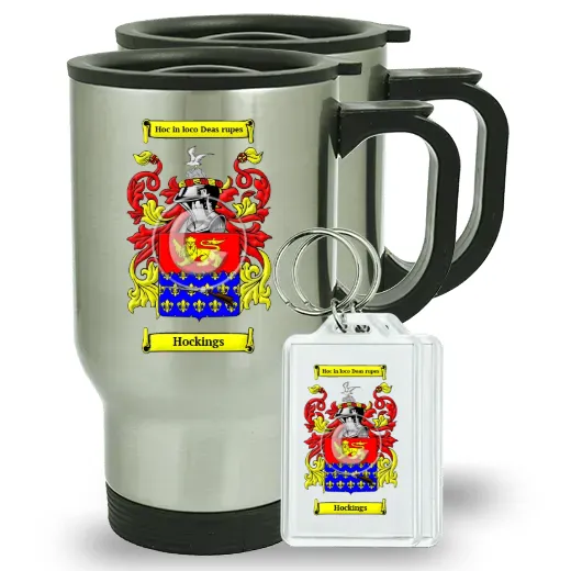 A set of two of our Coat of Arms Travel Mugs and set of two Keychains (same coat of arms). Each with a full color Coat of Arms with Family Crest shown on both sides of these beautiful items. Fill with the drink of your choice, and proudly show your family heritage. Excellent durability for years to come.