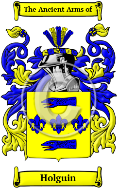 France Spain Etymology of HolguinWhat does the name Holguin mean? The distinguished Spanish surname Holguin is of nickname origin, derived from a nickname that illustrated a personal attribute or physical characteristic of the original bearer. In this instance, the surname derives from a diminutive form of the Castilian word "holgado," from the verb "holgar," meaning "to rest" or "to be inactive." However, beginning with the fourteenth century, the meaning of "holgar" changed slightly, meaning "to enjoy oneself," "to be happy." Early Origins of the Holguin familyThe surname Holguin was first found in Cáceres, in the ancient kingdom of Castile, where the family held their ancestral seat. Early references show that Juan Alvarez de Holguin was Governor of Castelbono in 1292, a position which was also held by Juan Peres Holgin in 1460. Early History of the Holguin familyThis web page shows only a small excerpt of our Holguin research. Another 67 words (5 lines of text) covering the years 1486, 1490, 1525, 1530, 1542, 1560, 1581, 1600 and 1620 are included under the topic Early Holguin History in all our PDF Extended History products and printed products wherever possible. Holguin Spelling VariationsSpelling variations of this family name include: Olguin, Hollguin, Ologuin, Holquin and others. Early Notables of the Holguin family- Miguel Holguin de Figueroa, a military man who was born during the sixteenth century who in 1530, traveled to the New World, where he founded the city of San Miguel, Venezuela