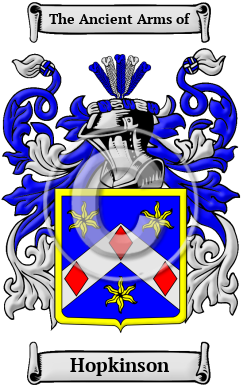 England Etymology of HopkinsonWhat does the name Hopkinson mean? Hopkinson is an ancient Anglo-Saxon surname that came from the name Hobb, a pet form of the personal name Robert. This name was supplemented by the common diminutive suffix -kin and the patronymic suffix -son, which superseded all other English patronymic suffixes during the 14th century. 1 Early Origins of the Hopkinson familyThe surname Hopkinson was first found in Cheshire, where Richard Hobbekynessone was found at Putnam in 1354. Later, in the historic English county of Yorkshire, John Hopkynson was listed in 1469. 2 Early History of the Hopkinson familyThis web page shows only a small excerpt of our Hopkinson research. Another 80 words (6 lines of text) covering the years 1567, 1583, 1610, 1680, 1737, 1776 and 1791 are included under the topic Early Hopkinson History in all our PDF Extended History products and printed products wherever possible. Hopkinson Spelling VariationsThe English language only became standardized in the last few centuries; therefore,spelling variations are common among early Anglo-Saxon names. As the form of the English language changed, even the spelling of literate people's names evolved. Hopkinson has been recorded under many different variations, including Hopkinson, Hobkinson and others. Early Notables of the Hopkinson family- William Hopkinson (fl. 1583), English divine, graduated B.A. in 1567 from St. John's College, Cambridge, and was a minister in Lincolnshire, perhaps at Kirton in Lindsey in that county. 3