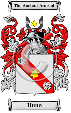 The distinguished German surname Huno is of two distinct origins. Firstly, the name is derived from the German personal name "Huno," a nickname for the name "Hunold." In this case, the surname would have been originally borne by the son of someone called Huno. Alternatively, the name is derived from the Middle High German word "huon," meaning "chicken." In this instance, the name would have been originally borne either by a chicken farmer as an occupational name or by a very talkative person as a nickname.