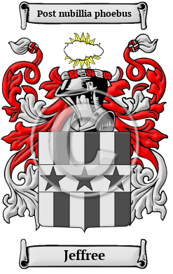 Scotland Early Origins of the Jeffree familyThe surname Jeffree was first found in Aberdeen where "Jaffray was an old family name." Early feudal rolls provided the king of the time a method of cataloguing holdings for taxation, but today they provide a glimpse into the wide surname spellings in use at that time. "Symon le fiz Geffrai and Piers le fiz Geffray, burgesses of Peebles, rendered homage [to King Edward I of England] in 1296. Payment was made to David Geoffrey, Scottish merchant, for injuries and trespasses committed on him in 1474, John Joffray appears as witness, 1511, and a later John Jofra was witness in Brechin in 1552." 1 Early History of the Jeffree familyThis web page shows only a small excerpt of our Jeffree research. Another 211 words (15 lines of text) covering the years 1536, 1583, 1587, 1596, 1605, 1613, 1614, 1618, 1629, 1632, 1633, 1634, 1635, 1636, 1642, 1643, 1644, 1645, 1652, 1653, 1673, 1687, 1718 and 1753 are included under the topic Early Jeffree History in all our PDF Extended History products and printed products wherever possible. Jeffree Spelling VariationsSpelling variations of this family name include: Jaffray, Jaffrey, Jafery and others. Early Notables of the Jeffree familyAlexander Jaffray (1614-1673), Director of the Chancellary of Scotland and a Quaker, son of Alexander Jaffray (d. 10 Jan. 1645), Provost of Aberdeen, by his wife Magdalen Erskine of Pittodrie, born at Aberdeen in July 1614. "Shortly after his marriage his father sent him to Edinburgh, where he stayed some time in the house of his relative Robert Burnet, father of Gilbert Burnet [q. v.] His father sent him in 1632 and 1633 to London, and in 1634 and 1635 to France. At Whitsuntide 1636 he set up housekeeping in Aberdeen, his wife having hitherto lived with his parents. He was... Another 142 words (10 lines of text) are included under the topic Early Jeffree Notables in all our PDF Extended History products and printed products wherever possible.