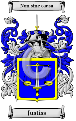 Scotland England Etymology of JustissWhat does the name Justiss mean? As early as c. 1172, this name was used by judicial officers or judges and it is from this source the surname was more than likely derived. While there may have been Norman roots at La Justice in Normandy, the name was more likely an occupational name for someone who held the office of "the justice," in other words a judge. Saint Justus (d. 627), was the fourth Archbishop of Canterbury, sent in 601 from Rome by Pope Gregory along with Laurentius, Mellitus, and others to reinforce the Kentish mission. Justus died on 10 Nov. 627, and was buried in St. Peter's porch at St. Augustine's, Canterbury. 1 Early Origins of the Justiss familyThe surname Justiss was first found in Perthshire (Gaelic: Siorrachd Pheairt) former county in the present day Council Area of Perth and Kinross, located in central Scotland, and Angus where one of the first records of the name was Patrick Justyce as a tenant of the mill at Kelso in 1472. Just two years later, Patrick Justice, a priest who witnessed an instrument of sasine in this shire in 1474. As the forename Patrick was not very popular at this time, these two references may be the same person. The lands of James Justeis and Thomas Justeis are mentioned in Scone in 1491. 2 The variants Jewson and Juson were mostly found further south in England. This illustrious family were originally found in Colchester, Essex where Richard Juwesone, Jullesome, Jullesone was recorded in 1333, 1340 and 1341. 3 It is generally thought the entries were all for the same person. Early History of the Justiss familyThis web page shows only a small excerpt of our Justiss research. Another 140 words (10 lines of text) covering the years 1400, 1450, 1567, 1600, 1673, 1745 and 1778 are included under the topic Early Justiss History in all our PDF Extended History products and printed products wherever possible. Justiss Spelling VariationsSpelling variations of this family name include: Justice, Justine, Justus and others. Early Notables of the Justiss familyMore information is included under the topic Early Justiss Notables in all our PDF Extended History products and printed products wherever possible. Migration of the Justiss familySome of the first settlers of this family name or some of its variants were: Henry Justice, who settled in Virginia in 1700; Hugh Justice settled in Virginia in 1723; another Henry Justice settled in Maryland in 1736; Sarah Justice arrived in San Francisco Cal. in 1862.