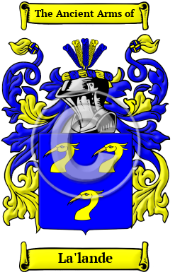 France Etymology of La'landeWhat does the name La'lande mean? Normandy is the region of ancient France from which the name La'lande was derived. It comes from when the family lived at Landes in Normandy. However, the name Lalonde is adapted from a word indicating a house beside the moor. Early Origins of the La'lande familyThe surname La'lande was first found in Normandy (French: Normandie), the former Duchy of Normandy, where they held a family seat from ancient times in a village and seigneurie in Seine-Inférieure in the arrondisement of Rouen. The family was ennobled in 1509 and they were later elevated to the baronage in Normandy and to Lords in Brittany (French: Bretagne), Forez, Poitou, and Quercy. 1 Jean de Lalonde, born in 1640, married Marie Barbary in 1669 in Montreal, Quebec. Together they had four children, three sons and one daughter. Two of their sons, Jean-Baptiste and Guillaume, eventually married and have many descendants in Canada. 2 Early History of the La'lande familyThis web page shows only a small excerpt of our La'lande research. Another 165 words (12 lines of text) covering the years 1351, 1646, 1657, 1665, 1726 and 1792 are included under the topic Early La'lande History in all our PDF Extended History products and printed products wherever possible. La'lande Spelling VariationsHistory has changed the spelling of most surnames. During the early development of the French language in the Middle Ages, a person gave his version of his name, phonetically, to a scribe, a priest, or a recorder. Some variables were adopted by different branches of the family name. Hence, there spelling variations of the name La'lande, some of which include Lalonde, Lalondes, La Londe, Lalande, La Lande, de Lalonde, des Lalondes, de Lalonde, de Lalande and many more. Early Notables of the La'lande family- Sir Richard Lalande, an Anglo-Breton Knight who bravely fought at the Combat of the Thirty on March 26th, 1351