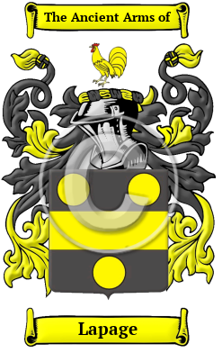 England France Etymology of LapageWhat does the name Lapage mean? The Lapage surname was no doubt an occupational name for someone who worked as a "law-page. Probably an apparitor or summoner, a servant of the law." 1 Early Origins of the Lapage familyThe surname Lapage was first found in Yorkshire, where Johannes Lawpage was listed in the Yorkshire Poll Tax Rrolls of 1379. 1 Christopher Lawpage was listed in Norfolk, but no date or location was given. 2 Early History of the Lapage familyThis web page shows only a small excerpt of our Lapage research. Another 148 words (11 lines of text) covering the years 1379, 1568, 1778, 1787 and 1798 are included under the topic Early Lapage History in all our PDF Extended History products and printed products wherever possible. Lapage Spelling VariationsUntil quite recently, the English language has lacked a definite system of spelling rules. Consequently, Anglo-Saxon surnames are characterized by a multitude of spelling variations. Changes in Anglo-Saxon names were influenced by the evolution of the English language, as it incorporated elements of French, Latin, and other languages. Although Medieval scribes and church officials recorded names as they sounded, so it is common to find one person referred to by several different spellings of his surname, even the most literate people varied the spelling of their own names. Variations of the name Lapage include Lappage, Lapage, Lappadge, Lapidge, Lawpage, Lapish, Lepage and many more. Early Notables of the Lapage familyMore information is included under the topic Early Lapage Notables in all our PDF Extended History products and printed products wherever possible. Migration of the Lapage familySearching for a better life, many English families migrated to British colonies. Unfortunately, the majority of them traveled under extremely harsh conditions: overcrowding on the ships caused the majority of the immigrants to arrive diseased, famished, and destitute from the long journey across the ocean. For those families that arrived safely, modest prosperity was attainable, and many went on to make invaluable contributions to the development of the cultures of the new colonies. Research into the origins of individual families in North America revealed records of the immigration of a number of people bearing the name Lapage or a variant listed above: Edward Lappage, who arrived in Maryland in 1681; Andrew LePage, who arrived in Prince Edward Island in 1806; Frederick Lepage, who was recorded as the shipping agent for St. John'.