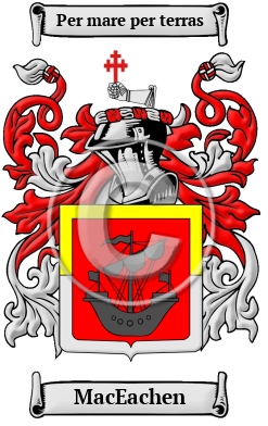 Scotland Ireland Etymology of MacEachenWhat does the name MacEachen mean? The ancestors of the MacEachen family come from the ancient Scottish kingdom of Dalriada. Their surname comes from person who was skilled in the riding of horses or who owned many horses. The Gaelic form of the name was Mac Eachthighearna, which translates as son of the horse-lord. 1 Early Origins of the MacEachen familyThe surname MacEachen was first found in Kintyre, where "on the shaft of the cross at Kilkerran near Campbeltown, is the inscription: Hec est: crvx: Coleni: Mc: Heachyrna: et Katirine: uxoris: eivs (Drummond, Sculptured monuments of Iona, pl. lxxxi). This is probably Colin MacEachern who was chief of the Macecherns in 1499." 1 Early History of the MacEachen familyThis web page shows only a small excerpt of our MacEachen research. Another 188 words (13 lines of text) covering the years 1499, 1505, 1506, 1507, 1512, 1515, 1541, 1596, 1605, 1647, 1659, 1662, 1682, 1684, 1694, 1769, 1788, 1798, 1801, 1806, 1814, 1818, 1847, 1849 and 1888 are included under the topic Early MacEachen History in all our PDF Extended History products and printed products wherever possible. MacEachen Spelling VariationsMedieval spelling was at best an intuitive process, and translation between Gaelic and English was no more effective. These factors caused an enormous number of spelling variations in Dalriadan names. In fact, it was not uncommon to see a father and son who spelled their name differently. Over the years, MacEachen has been spelled MacEachern, MacEachen, MacEachan, MacEachin, MacEachren and many more. Early Notables of the MacEachen family- Evan MacEachen (1769-1849), Gaelic scholar, born at Arisaig, Invernessshire, in 1769, was educated in a school at Ruthven, near Keith...