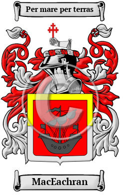 Scotland Ireland Etymology of MacEachranWhat does the name MacEachran mean? The Clan from whom the MacEachran family descends began among the ancient Dalriadan kingdom of the west coast of Scotland. Their name comes from person who was skilled in the riding of horses or who owned many horses. The Gaelic form of the name was Mac Eachthighearna, which translates as son of the horse-lord. 1 Early Origins of the MacEachran familyThe surname MacEachran was first found in Kintyre, where "on the shaft of the cross at Kilkerran near Campbeltown, is the inscription: Hec est: crvx: Coleni: Mc: Heachyrna: et Katirine: uxoris: eivs (Drummond, Sculptured monuments of Iona, pl. lxxxi). This is probably Colin MacEachern who was chief of the Macecherns in 1499." 1 Early History of the MacEachran familyThis web page shows only a small excerpt of our MacEachran research. Another 188 words (13 lines of text) covering the years 1499, 1505, 1506, 1507, 1512, 1515, 1541, 1596, 1605, 1647, 1659, 1662, 1682, 1684, 1694, 1769, 1788, 1798, 1801, 1806, 1814, 1818, 1847, 1849 and 1888 are included under the topic Early MacEachran History in all our PDF Extended History products and printed products wherever possible. MacEachran Spelling VariationsHistorical recordings of the name MacEachran include many spelling variations. They are the result of repeated translations of the name from Gaelic to English and inconsistencies in spelling rules. They include MacEachern, MacEachen, MacEachan, MacEachin, MacEachren and many more. Early Notables of the MacEachran familyEvan MacEachen (1769-1849), Gaelic scholar, born at Arisaig, Invernessshire, in 1769, was educated in a school at Ruthven, near Keith. He was sent in 1788 to the Scots College at Valladolid, where he was ordained priest in 1798. On his return to the mission he was stationed at Arisaig. In 1801 he was removed to Badenoch, and thence was sent, about 1806, in the... Another 63 words (4 lines of text) are included under the topic Early MacEachran Notables in all our PDF Extended History products and printed products wherever possible. Migration of the MacEachran family to IrelandSome of the MacEachran family moved to Ireland, but this topic is not covered in this excerpt. Another 39 words (3 lines of text) about their life in Ireland is included in all our PDF Extended History products and printed products wherever possible. Migration of the MacEachran familySignificant portions of the populations of both the United States and Canada are still made up of the ancestors of Dalriadan families. Some of those in Canada originally settled the United States, but went north as United Empire Loyalists in the American War of Independence. The late 19th and early 20th centuries saw the ancestors of many Scots on both sides of the border begin to recover their collective national heritage through Clan societies and highland games. Some of the first North American settlers carried this name or one of its variants: Archibald MacEachern and his wife Jean, who settled in New York State with the children in 1738; Donald MacEachern and his wife Anne settled with his child in New York State in 1738.
