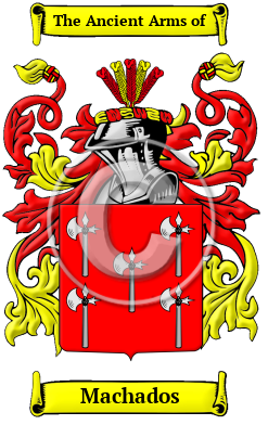 The Machados surname comes from the Portuguese word "machado," which means "axe." Family legend has it that in Medieval Portugal in 1147, after the Moors had taken the castle at Santarem, the Portuguese attacked the castle. Mendo Moniz and his two sons Pedro and Nono Mendes beat down the door with their hatchets and were the first to enter the besieged castle. In honor of the valiant deed, one of Pedro's sons, Martim Pires, was called "Machado" as a nickname, which was then taken on as the family surname. Martim lived during the reign of Alfonso II (1152-96), and was married to Maria Moniz.