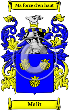 England Etymology of MalitWhat does the name Malit mean? The Norman Conquest of England of 1066 added many new elements to the already vibrant culture. Among these were thousands of new names. The Malit name is derived from the given name Malle, which is an Old English diminutive of Mary. The name Mary was originally, a Hebrew personal name meaning wished for child. The name Malit is also derived from the given name Malo, a popular form of the name of Saint Maclovius, the 6th century Welsh monk who gave his name to the church of Saint Maclou in Rouen. Personal names derived from the names of saints, apostles, biblical figures, and missionaries are widespread in most European countries. In the Middle Ages, they became increasingly popular because people believed that the souls of the deceased continued to be involved in this world. They named their children after saints in the hope that the child would be blessed or protected by the saint. Early Origins of the Malit familyThe surname Malit was first found in Suffolk where they held a family seat as Lords of the Manor of Cidestan. "All the families of this name in England trace their descent from the renowned William Lord Mallet de Graville, one of the great barons who accompanied William the Conqueror." 1 "No figure stands out more vividly in the great battle of the Conquest than does 'Guillame whom they call Malet,' as Wace suggests for bravery." 2 William, Lord Malet of Greville was one of the greatest landowners in England, having 221 manors in Suffolk alone. He was ancestor of the Mallets of Somerset, Devon, and Cornwall, and those now resident in Jersey. William Mallet was descended from Gerard, a Viking prince and companion of Rollo, the first Duke of Normandy, about 950. They held the castle of Graville near Havre. Maternally, William Mallet was a Saxon, descended from the Earls of Mercia, and more distantly related to Morcar and Edwin, Earls of Northumberland. William Mallet was at the Battle of Hastings, and was instructed by William the Conqueror to take care of the slain King Harold's body. 3 In 1068, he proceeded north with William and led in the reduction of the cities of Nottingham and York. Robert Malet or Mallet (d. 1106?), Baron of Eye, was "the elder son of William Malet of Graville, and succeeded to his father's possessions on his father's death in 1076. At Eye, Malet built and endowed a monastery of Benedictine monks. From his position he enjoyed considerable influence in the eastern counties, and he took a prominent part in repressing the rebellion of Ralph, Earl of Norfolk, in 1075-6, and in the capture of Norwich Castle which followed. In King William's grant of the manor of Fracenham to Archbishop Lanfranc, Malet is styled vice-comes or sheriff, and later on, at the beginning of Henry I's reign, he appears as great chamberlain of England. In the struggle between Henry and Duke Robert, Malet espoused Robert's cause, and shortly after Henry's accession he was banished from England, together with other adherents of Robert, and his estates in England were confiscated and bestowed by Henry upon Stephen of Blois. He retired to Normandy, and is supposed to have been killed at the battle of Tinchebrai in 1106." 4 "Mallett is a slightly altered form of a very ancient name in Norfolk, where it has remained ever since the time of William the Conqueror, when Roger Mallet or Malet, lord of Eye in Suffolk, received an extensive grant of lands. The name of Malet was common in the adjoining county of Lincoln as well as in the distant county of Somerset in the reign of Edward I." 5 Early feudal rolls provided the king of the time a method of cataloguing holdings for taxation, but today they provide a glimpse into the wide use of the name throughout ancient Britain. The Hundredorum Rolls of 1273 included Malet filius Henry. C. Baldwin Malet, Somerset; Sarra Malet, Cambridgeshire; and Harvey Malet, Buckinghamshire. 6 The Testa de Nevill, sive Liber Feodorum, temp. Henry III-Edward I. included Alan Malet in Derbyshire, Henry III-Edward I. 7 The Yorkshire Poll Tax Rolls of 1379 listed Magota Malet and Yohannes Malet as holding lands there at that time. 6 Early History of the Malit familyThis web page shows only a small excerpt of our Malit research. Another 137 words (10 lines of text) covering the years 1086, 1195, 1204, 1211, 1214, 1215, 1290, 1582, 1600, 1606, 1614, 1622, 1623, 1626, 1665, 1666, 1672, 1679, 1681, 1683, 1685, 1686, 1701 and 1706 are included under the topic Early Malit History in all our PDF Extended History products and printed products wherever possible. Malit Spelling VariationsA multitude of spelling variations characterize Norman surnames. Many variations occurred because Old and Middle English lacked any definite spelling rules. The introduction of Norman French to England also had a pronounced effect, as did the court languages of Latin and French. Therefore, one person was often referred to by several different spellings in a single lifetime. The various spellings include Mallet, Mallett, Mallit, Mallitt, Malott, Mallot and many more. Early Notables of the Malit familySir Thomas Malet (1582-1665) was an English judge and politician from Poyntington, Somerset, Solicitor General to Queen Henrietta Maria, imprisoned in the Tower of London for two years, Member of Parliament for Tregony (1614-1622.) He was the "great-grandson of Sir Baldwin Malet of St. Audries, Somerset, solicitor-general to Henry VIII, and a descendant of William Malet of Graville, Normandy... Another 58 words (4 lines of text) are included under the topic Early Malit Notables in all our PDF Extended History products and printed products wherever possible. Migration of the Malit familyMany English families left England, to avoid the chaos of their homeland and migrated to the many British colonies abroad. Although the conditions on the ships were extremely cramped, and some travelers arrived diseased, starving, and destitute, once in the coloni