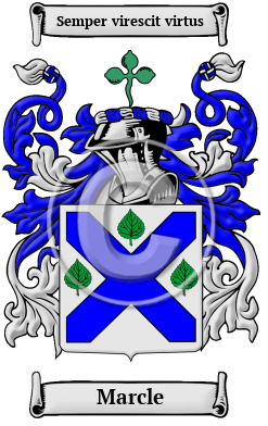 | Marcle History, Family Crest & Coats of Arms Etymology of MarcleWhat does the name Marcle mean? The surname Marcle is a name of ancient Norman origin. It comes from the Old French "mareschal," which is in turn derived from the Germanic elements "marah," meaning "horse" and "scalc," or "servant." Thus the name was originally used for a person who tended horses. Around the same time that surnames were being formed, the marshall was one of the most important servants in the houses of the nobility. 1 "This being a name of office (the Marshal being a feudal officer of eminence appointed by each great baron) includes a number of different families." 2 Early Origins of the Marcle familyThe surname Marcle was first found in Lothian, where the Clan is said to be descended from Robert, an early Chieftain of the Catti tribe, and possibly one of the earliest settlers in Scotland. Robert joined King Malcolm II at the battle of Panbridge, in 1006, against Camus, leader of the Danes. Robert slew Camus for which King Malcolm granted Robert the hereditary title of Marshall of Scotland, with a barony in Lothian and the island of Inskeith in the gulf of Edinburgh. It is for this title that the Keiths are sometimes known as the Marshalls, and many Clansmen adopted that name. "Maledoni Marescal is witness to gift of the lands of Perdeyc (Partick) to the church of Glasgow, 1136. About 1170 Symon Mare-scall witnessed a charter by Walter de Berkeley, and between 1178-80 Gillecolm Merescald witnessed a charter by William the Lion of Kinbethach to Gilbert, earl of Strathern. Guldone marescaldus witnessed a charter by Robert, bishop of St. Andrews before 1173 and Robert Merescaldus de Molle witnessed EsChina de London's gift of the church of Molle to Kelso, c. 1185-1190. Philip Merescallus, a charter witness between 1187-c. 1202, married the heiress of Keith-Humbie, and thus became ancestor of the Keiths, Earls Marischal. Adam, merescallus of the bishop of Glasgow, witnessed sale of lands of Scrogges to the church of Glasgow, c. 1208-1213." 3 Early History of the Marcle familyThis web page shows only a small excerpt of our Marcle research. Another 441 words (32 lines of text) covering the years 1304, 1438, 1464, 1748, 1775, 1796, 1833, 1851, 1855 and 1890 are included under the topic Early Marcle History in all our PDF Extended History products and printed products wherever possible. Marcle Spelling VariationsSpelling variations of this family name include: Marshall, Marshal, Marescal, Marescall, Merchel, Mercial, Mershell, Mersell, Marshale and many more. Early Notables of the Marcle familyRichard Marshal, 13th century knight; Andrew Marshal, 18th century physician born in Fife; Henry Marshall (1775-1851), physician and Inspector-General of army hospitals born in Stirlingshire; James Marshall (1796-1855) of Bute, preacher and author; and Sir James... Another 35 words (2 lines of text) are included under the topic Early Marcle Notables in all our PDF Extended History products and printed products wherever possible. Migration of the Marcle family to IrelandSome of the Marcle family moved to Ireland, but this topic is not covered in this excerpt. Another 82 words (6 lines of text) about their life in Ireland is included in all our PDF Extended History products and printed products wherever possible. Migration of the Marcle familySome of the first settlers of this family name or some of its variants were: Mary, Robert, and Thomas Marshall and Joseph Marshale, who all sailed to St. John New Brunswic in 1834; Courtenay Marshall, who settled in Kansas in 1895.