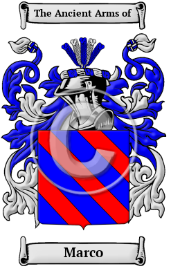 Italy Spain Etymology of MarcoWhat does the name Marco mean? The mountainous borders of Spain contain the origins of the prestigious surname Marco. The earliest forms of hereditary surnames in Spain were the patronymic surnames, which are derived from the father's given name, and metronymic surnames, which are derived from the mother's given name. Spanish patronymic names emerged as early as the mid-9th century and the most common patronymic suffix is ez. Early Origins of the Marco familyThe surname Marco was first found in Castile, predominant among the Christian kingdoms of medieval Spain. Early History of the Marco familyThis web page shows only a small excerpt of our Marco research. Another 66 words (5 lines of text) covering the year 1026 is included under the topic Early Marco History in all our PDF Extended History products and printed products wherever possible. Marco Spelling VariationsSpelling variations of this family name include: Márquez, Marquez, Marque, Márquiz, Marquiz, Marco and many more. Early Notables of the Marco family- nineteenth century Spanish playwright José Marco y Sánchez