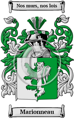 France Etymology of MarionneauWhat does the name Marionneau mean? The name Marionneau comes from the ancient Medieval culture of France, that specifically of a northwestern region known as Breton. It was a name for a devotee of the Virgin Mary. Tracing the origin of the name further, we found the name Marionneau was derived from the Hebrew name Miryam, which means wished for child. Early Origins of the Marionneau familyThe surname Marionneau was first found in Brittany (French: Bretagne), where this family held a family seat since ancient times. The branch Marionel in Lorraine was ennobled in 1598. Thomas Marie, of the branch established in Burgundy, was ennobled in 1661, in return for his services in the position of lieutenant-general in the bailiwick, and of mayor of Auxerre, a position which he had held over a duration of ten years. The branch Marion de la Bretonnière was ennobled in 1704. Of the branch Marion de Procé came two aldermen of Nantes, in 1669 and in 1780, and also two magistrates. Charles-Stanislas Marion was a general, who entered into the nobility in 1810, and François-Louis Marion was a chief commander in Napoleon's empire, who received his title to nobility in 1814. The members of the branch established in Lorraine became barons in 1816. From the branch Marion de Beaulieu stemmed a brigadier and a Baron in 1820. Also in 1820, the members of the branch Marion des Noyers, in Brittany, became barons. In Guyenne, some members of the family settled in a town in the department of Gironde, in the district of Bazas. Nicolas Marion, Lord of Fontaine and merchant of Quebec, married Marie Gueric in France in 1665. They travelled together to the New World, along with their son, Guillaume, who was born in 1667. Guillaume married Marie-Madeleine Demers in Quebec in 1698. 1 Early History of the Marionneau familyThis web page shows only a small excerpt of our Marionneau research. Another 53 words (4 lines of text) covering the years 1400, 1483, 1620, 1684, 1795, 1821, 1870 and 1881 are included under the topic Early Marionneau History in all our PDF Extended History products and printed products wherever possible. Marionneau Spelling VariationsFrench surnames were subject to numerous spelling alterations depending on the region and time it was used. The early development of the French language relied heavily on borrowing elements and grammar from other languages. For example, Old French was infused with Germanic words and sounds when barbarian tribes invaded and settled in France after the fall of the Roman Empire. Middle French also borrowed heavily from the Italian language during the Renaissance. As a result of these linguistic and cultural influences, the name Marionneau is distinguished by a number of regional variations. The many spelling variations of the name include Marion, Marionnaud, Marionneau, Mariot, Mariotte, Mariolle, Marie, Mariel, Marielle, Marionel, Marionelle, Mariet, Mariette, Mariéton and many more. Early Notables of the Marionneau familyAnother 34 words (2 lines of text) are included under the topic Early Marionneau Notables in all our PDF Extended History products and printed products wherever possible. Marionneau RankingFrance, the name Marionneau is the 6,623rd most popular surname with an estimated 1,000 - 1,500 people with that name. 2