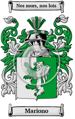 France Etymology of MarionoWhat does the name Mariono mean? The name Mariono comes from the ancient Medieval culture of France, that specifically of a northwestern region known as Breton. It was a name for a devotee of the Virgin Mary. Tracing the origin of the name further, we found the name Mariono was derived from the Hebrew name Miryam, which means wished for child. Early Origins of the Mariono familyThe surname Mariono was first found in Brittany (French: Bretagne), where this family held a family seat since ancient times. The branch Marionel in Lorraine was ennobled in 1598. Thomas Marie, of the branch established in Burgundy, was ennobled in 1661, in return for his services in the position of lieutenant-general in the bailiwick, and of mayor of Auxerre, a position which he had held over a duration of ten years. The branch Marion de la Bretonnière was ennobled in 1704. Of the branch Marion de Procé came two aldermen of Nantes, in 1669 and in 1780, and also two magistrates. Charles-Stanislas Marion was a general, who entered into the nobility in 1810, and François-Louis Marion was a chief commander in Napoleon's empire, who received his title to nobility in 1814. The members of the branch established in Lorraine became barons in 1816. From the branch Marion de Beaulieu stemmed a brigadier and a Baron in 1820. Also in 1820, the members of the branch Marion des Noyers, in Brittany, became barons. In Guyenne, some members of the family settled in a town in the department of Gironde, in the district of Bazas. Nicolas Marion, Lord of Fontaine and merchant of Quebec, married Marie Gueric in France in 1665. They travelled together to the New World, along with their son, Guillaume, who was born in 1667. Guillaume married Marie-Madeleine Demers in Quebec in 1698. 1 Early History of the Mariono familyThis web page shows only a small excerpt of our Mariono research. Another 53 words (4 lines of text) covering the years 1400, 1483, 1620, 1684, 1795, 1821, 1870 and 1881 are included under the topic Early Mariono History in all our PDF Extended History products and printed products wherever possible. Mariono Spelling VariationsThroughout the course of history most surnames have undergone changes for many reasons. During the early development of the French language, a son and father may not have chosen to spell their name the same way. Many are simple spelling changes by a person who gave his name, phonetically, to a scribe, priest, or recorder. Many names held prefixes or suffixes which became optional as they passed through the centuries, or were adopted by different branches to signify either a political or religious adherence. Hence, we have many spelling variations of this name, Mariono some of which are Marion, Marionnaud, Marionneau, Mariot, Mariotte, Mariolle, Marie, Mariel, Marielle, Marionel, Marionelle, Mariet, Mariette, Mariéton and many more. Early Notables of the Mariono familyAnother 34 words (2 lines of text) are included under the topic Early Mariono Notables in all our PDF Extended History products and printed products wherever possible. Migration of the Mariono familyIn 1643, 109 years after the first landings by Cartier, there were only about 300 people in Quebec. Migration was slow. The fur trade attracted migrants, both noble and commoner. By 1675, there were 7000 French in Quebec. By the same year the French Acadian presence in the Maritimes had reached 500. The French founded Lower Canada, thus becoming one of the two great founding nations of Canada. The family name Mariono has made many distinguished contributions in France and New France to the world of science, culture, religion, and education. Amongst the settlers in North America with this distinguished name Mariono were Pierre Marionneau, who lived in Louisiana in 1722; Joseph Marie, who was a fisherman in New Orleans in 1727; Thérèse Marie, who lived in New Orleans in 1727.
