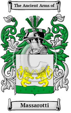| Massarotti History, Family Crest & Coats of Arms Etymology of MassarottiWhat does the name Massarotti mean? Tuscany, one of the oldest and most beautiful island regions of Italy, is the esteemed birthplace of numerous prominent families, including the family that bears the surname Massarotti. Although people were originally known only by a single name, it became necessary for people to adapt a second name to identify themselves as populations grew and travel became more frequent. The process of adopting fixed hereditary surnames was not complete until the modern era; the use of hereditary family names in Italy began in the 10th and 11th centuries. Italian hereditary surnames were developed according to fairly general principles and they are characterized by a profusion of derivatives coined from given names. Although the most common type of family name found in Tuscany is the patronymic surname, which is derived from the father's givenname, names derived from occupations are also found. Occupational surnames, which are less common that other types of surnames in Italy, date back to the feudal era. However, under the Feudal System, occupational names did not become hereditary until the offices themselves became hereditary. It was only after an occupation was inherited by several generations in lineal descent, that occupational names came to be applied to entire families, and so became a hereditary surname. The surname Massarotti is a name for a person who worked on a farm as a manager deriving its origin from the ancient Italian word massaio. Early Origins of the Massarotti familyThe surname Massarotti was first found in the town of Lucca. Records are found in 1285 with Mazzeo di Gerardo Mazzei, mayor of the Commune of Pietrasanta. Early History of the Massarotti familyThis web page shows only a small excerpt of our Massarotti research. The years 1439, 1450, 1516, 1526, 1569, 1633, 1653, 1687, 1723, 1730, 1766 and 1820 are included under the topic Early Massarotti History in all our PDF Extended History products and printed products wherever possible. Massarotti Spelling VariationsThere are many variations of most of those Italian names that originated in the medieval era. Some of these come from regional differences, like the tradition of ending northern names in "o" and southern names in "i". Others come from inaccuracies in the recording process, which were extremely common in the eras before dictionaries standardized spelling. Some of the spelling variations of Massarotti are Massari, Massaro, Amassari, Massai, Massarelli, Massarini, Massarino, Massarin, Massaroli, Massarolli, Massariolo, Massarotti, Massarotto, Massarutti, Massarutto, Massarut, Massardo, Massarente, Massarenti, Massiani, Massei and many more. Early Notables of the Massarotti family- Angelo Massarotti (1653-1723) was an Italian painter of the Baroque period, active in his native Cremona