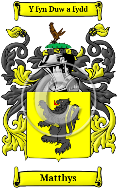 | Matthys History, Family Crest & Coats of Arms Etymology of MatthysWhat does the name Matthys mean? The surname Matthys is a patronymic surname created from the personal name Matthew. Early Origins of the Matthys familyThe surname Matthys was first found in Glamorganshire (Welsh: Sir Forgannwg), a region of South Wales, anciently part of the Welsh kingdom of Glywysing, where they held a family seat from early times and their first records appeared on the early census rolls taken by the early Kings of Britain to determine the rate of taxation of their subjects. Early History of the Matthys familyThis web page shows only a small excerpt of our Matthys research. Another 109 words (8 lines of text) covering the years 1378, 1400, 1408, 1484, 1546, 1577, 1600, 1628, 1655, 1656, 1660, 1676, 1751, 1797 and 1890 are included under the topic Early Matthys History in all our PDF Extended History products and printed products wherever possible. Matthys Spelling VariationsWelsh surnames are relatively few in number, but they have an inordinately large number of spelling variations. There are many factors that explain the preponderance of Welsh variants, but the earliest is found during the Middle Ages when Welsh surnames came into use. Scribes and church officials recorded names as they sounded, which often resulted in a single person's name being inconsistently recorded over his lifetime. The transliteration of Welsh names into English also accounts for many of the spelling variations: the unique Brythonic Celtic language of the Welsh had many sounds the English language was incapable of accurately reproducing. It was also common for members of a same surname to change their names slightly, in order to signify a branch loyalty within the family, a religious adherence, or even patriotic affiliations. For all of these reasons, the many spelling variations of particular Welsh names are very important. The surname Matthys has occasionally been spelled Mathews, Mathew, Matthew, Matthews, Mathewes and others. Early Notables of the Matthys familySir David Mathew (1400-1484) was a Welsh knight, Lord of Llandaff, Seneschal of Llandaff Cathedral, one of the ten Great Barons of Glamorgan, Marcher Lord and Standard Bearer of England; Pope Matthew I of Alexandria (Matheos) (1378-1408), 87th Coptic Pope of Alexandria and Patriarch of the See of St. Mark, revered as a saint by the Coptic Church; Tobias... Another 59 words (4 lines of text) are included under the topic Early Matthys Notables in all our PDF Extended History products and printed products wherever possible. Migration of the Matthys family to IrelandSome of the Matthys family moved to Ireland, but this topic is not covered in this excerpt. Another 92 words (7 lines of text) about their life in Ireland is included in all our PDF Extended History products and printed products wherever possible.