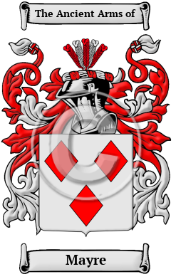 France Etymology of MayreWhat does the name Mayre mean? The Mayre surname is an occupational name, and was probably first borne by someone who was a town mayor. Early Origins of the Mayre familyThe surname Mayre was first found in Burgundy (French: Bourgogne), an administrative and historical region of east-central France, where early records indicate that bearers of this name had long been established. Early History of the Mayre familyThis web page shows only a small excerpt of our Mayre research. Another 52 words (4 lines of text) covering the years 1350, 1586, 1602, 1798, 1813 and 1880 are included under the topic Early Mayre History in all our PDF Extended History products and printed products wherever possible. Mayre Spelling VariationsSpelling variations of this family name include: Maire, Maires, la Maire, Lamaire, Lamaires, de Maire, Mayre, Mayres, Demaire, Demaires, Le Maire, Lemaire, Lemaires, Le Mayre, Lemayre, Lemayres, de Mayre, Demayre, Demayres, Mairre, Mairres, Meire, Meirre and many more. Early Notables of the Mayre familyJean Le Maire, seigneur (Lord) of La Bondue, who was ennobled, and his son Jean, who was a government official in the "bailliages" d'Autun et de Montcenis, and later prosecuting attorney for duke Charles in the duchy of Burgundy. The descendants of Jean continued to hold high positions in the governments of the region. Jean Le Maire, a skilled rider was named... Another 62 words (4 lines of text) are included under the topic Early Mayre Notables in all our PDF Extended History products and printed products wherever possible.
